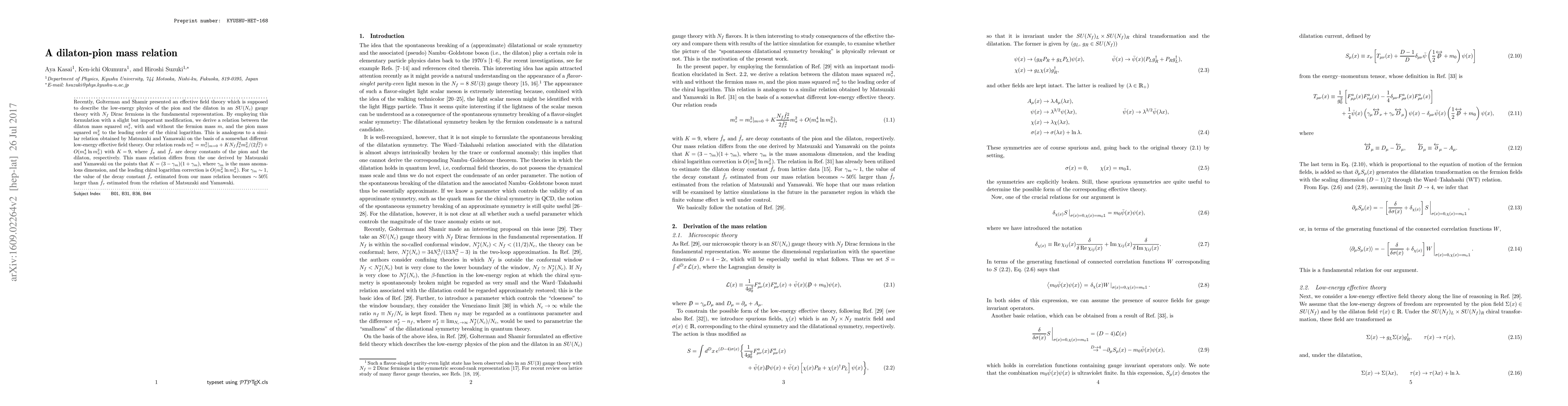 Recently, Golterman and Shamir presented an effective field theory which is supposed to describe the low-energy physics of the pion and the dilaton in an $SU(N_c)$ gauge theory with $N_f$ Dirac fermions in the fundamental representation. By employing this formulation with a slight but important modification, we derive a relation between the dilaton mass squared~$m_\tau^2$, with and without the fermion mass~$m$, and the pion mass squared~$m_\pi^2$ to the leading order of the chiral logarithm. This is analogous to a similar relation obtained by Matsuzaki and~Yamawaki on the basis of a somewhat different low-energy effective field theory. Our relation reads $m_\tau^2=m_\tau^2|_{m=0}+KN_f\hat{f}_\pi^2m_\pi^2/(2\hat{f}_\tau^2)+O(m_\pi^4\ln m_\pi^2)$ with~$K=9$, where $\hat{f}_\pi$ and~$\hat{f}_\tau$ are decay constants of the pion and the dilaton, respectively. This mass relation differs from the one derived by Matsuzaki and~Yamawaki on the points that $K=(3-\gamma_m)(1+\gamma_m)$, where $\gamma_m$ is the mass anomalous dimension, and the leading chiral logarithm correction is~$O(m_\pi^2\ln m_\pi^2)$. For~$\gamma_m\sim1$, the value of the decay constant~$\hat{f}_\tau$ estimated from our mass relation becomes $\sim50\%$ larger than $\hat{f}_\tau$ estimated from the relation of Matsuzaki and~Yamawaki.