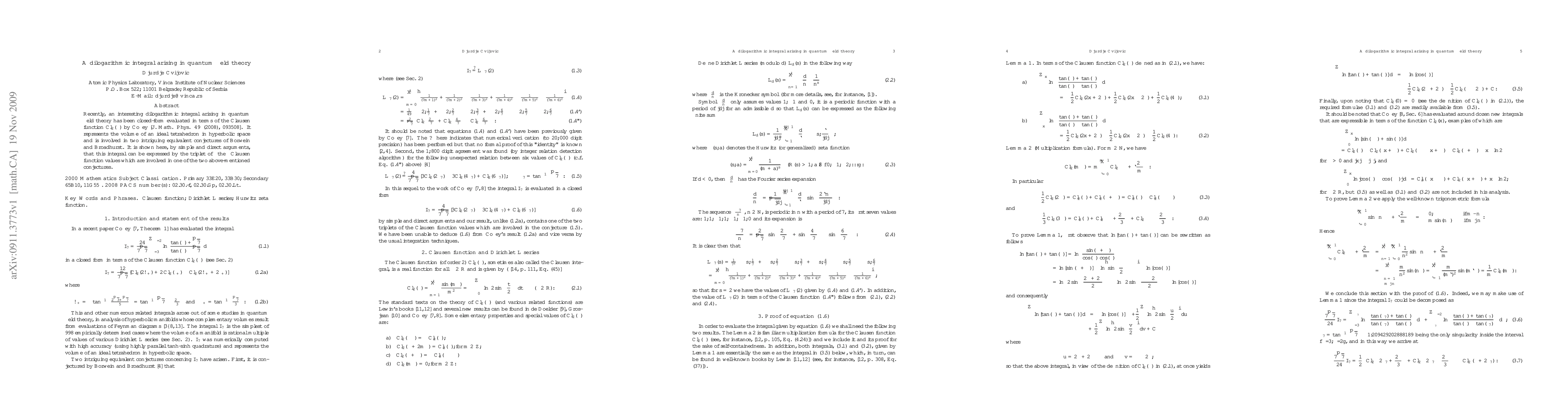 This paper demonstrates that a dilogarithmic integral in quantum field theory, previously evaluated using the Clausen function, can be expressed using a triplet of Clausen function values tied to one of Borwein and Broadhurst's conjectures. The methodology is straightforward and direct.