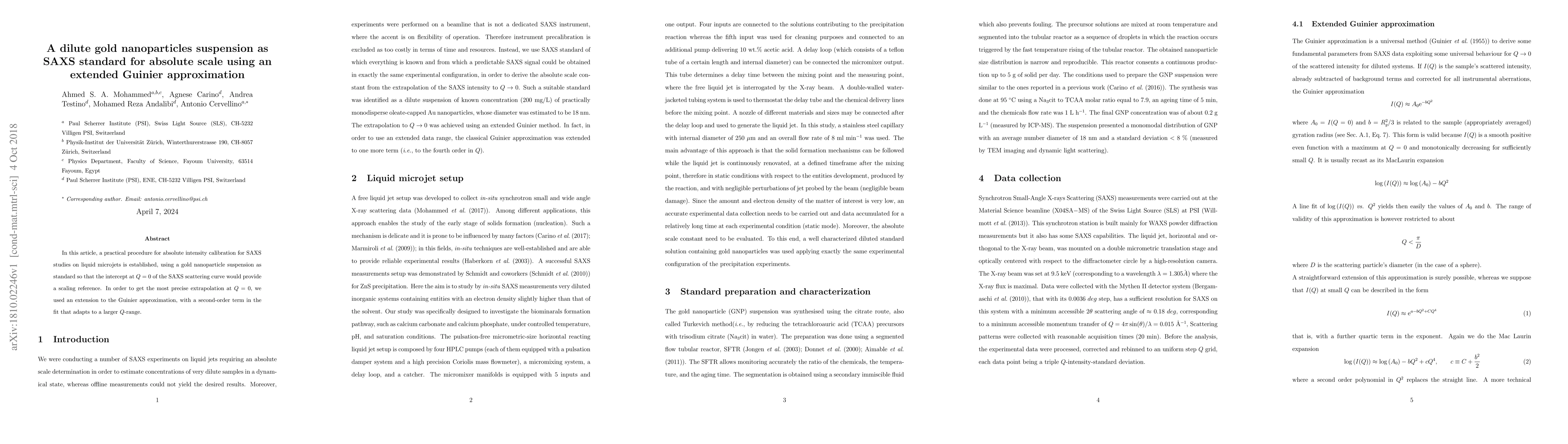 In this article, a practical procedure for absolute intensity calibration for SAXS studies on liquid microjets is established, using a gold nanoparticle suspension as standard so that the intercept at $Q=0$ of the SAXS scattering curve would provide a scaling reference. In order to get the most precise extrapolation at $Q=0$, we used an extension to the Guinier approximation, with a second-order term in the fit that adapts to a larger $Q$-range.