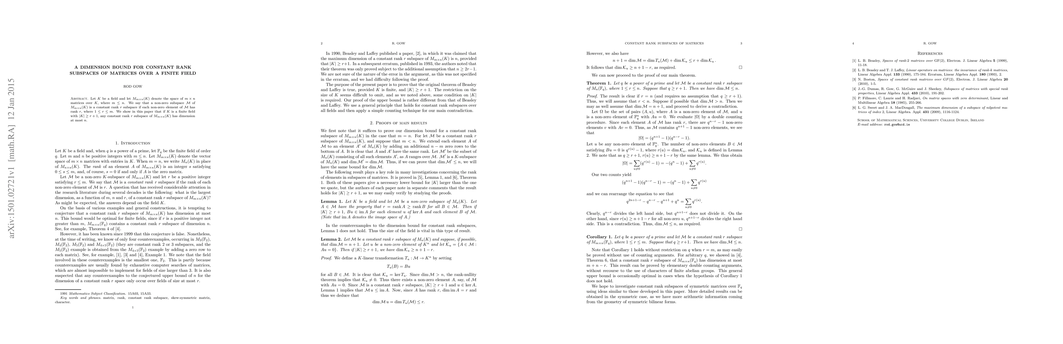 This paper establishes a dimension bound for constant rank subspaces of matrices over a finite field: any constant rank r subspace of m x n matrices over a finite field K with at least r+1 elements has dimension at most n.