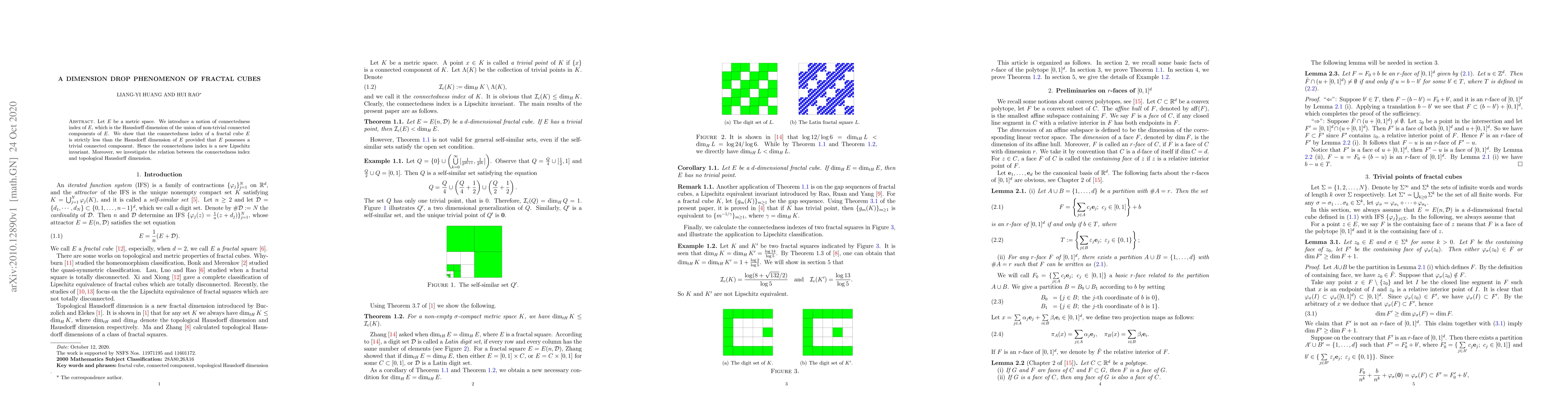 Let E be a metric space. We introduce a notion of connectedness index of E, which is the Hausdor? dimension of the union of non-trivial connected components of E. We show that the connectedness index of a fractal cube E is strictly less than the Hausdor? dimension of E provided that E possesses a trivial connected component. Hence the connectedness index is a new Lipschitz invariant. Moreover, we investigate the relation between the connectedness index and topological Hausdor? dimension.