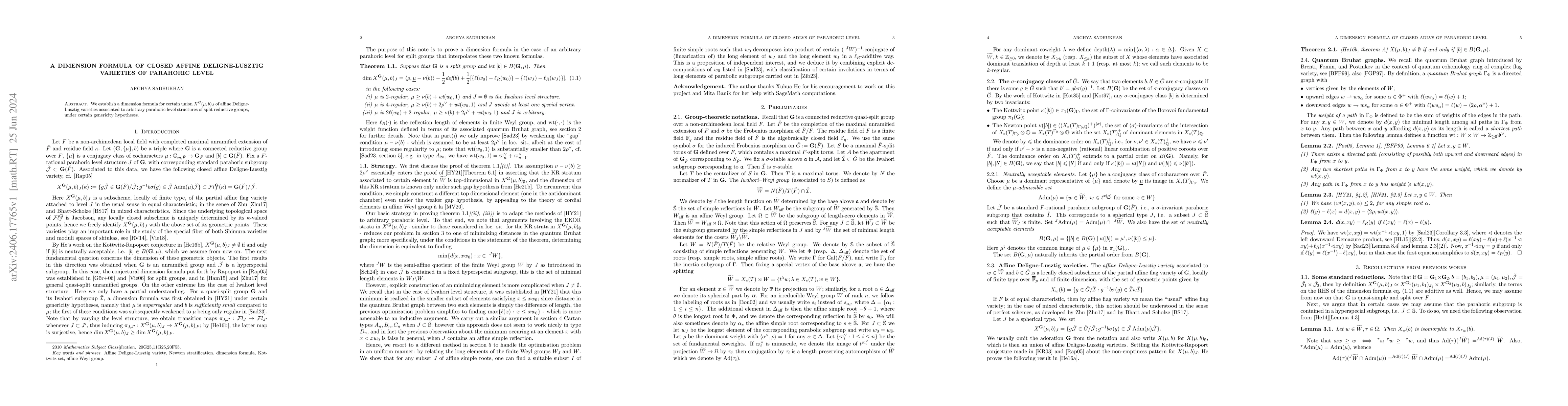 The paper establishes a dimension formula for the union $X^G(\mu,b)_J$ of affine Deligne-Lusztig varieties linked to parahoric level structures in split reductive groups, under specific generic conditions. This provides a significant result for understanding the geometric properties of these varieties.