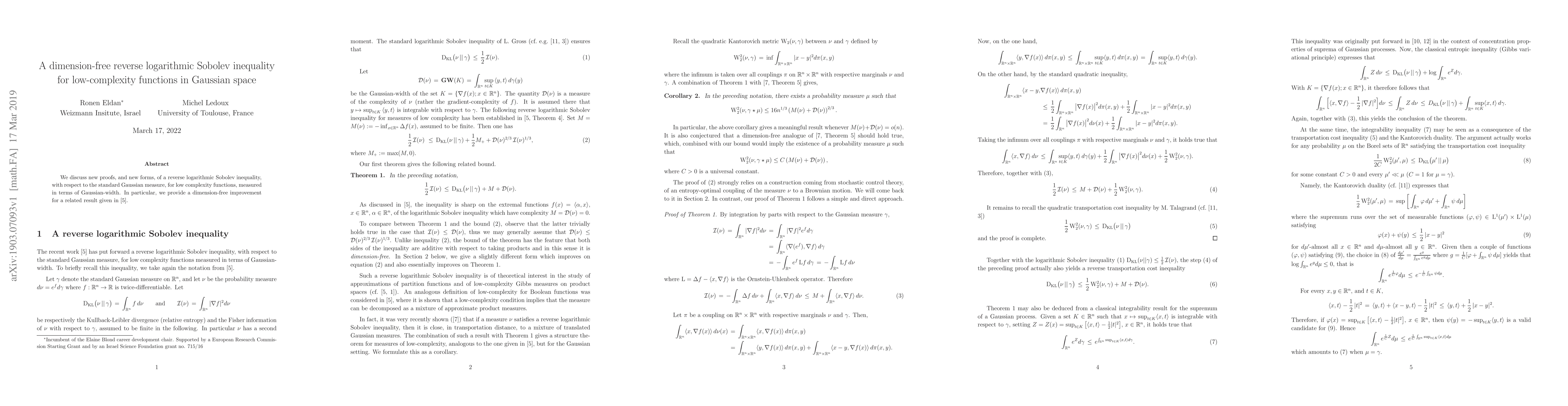 Summary: This paper presents improved proofs and forms of a reverse logarithmic Sobolev inequality for low complexity functions in Gaussian space, specifically achieving a dimension-free enhancement over previous results.