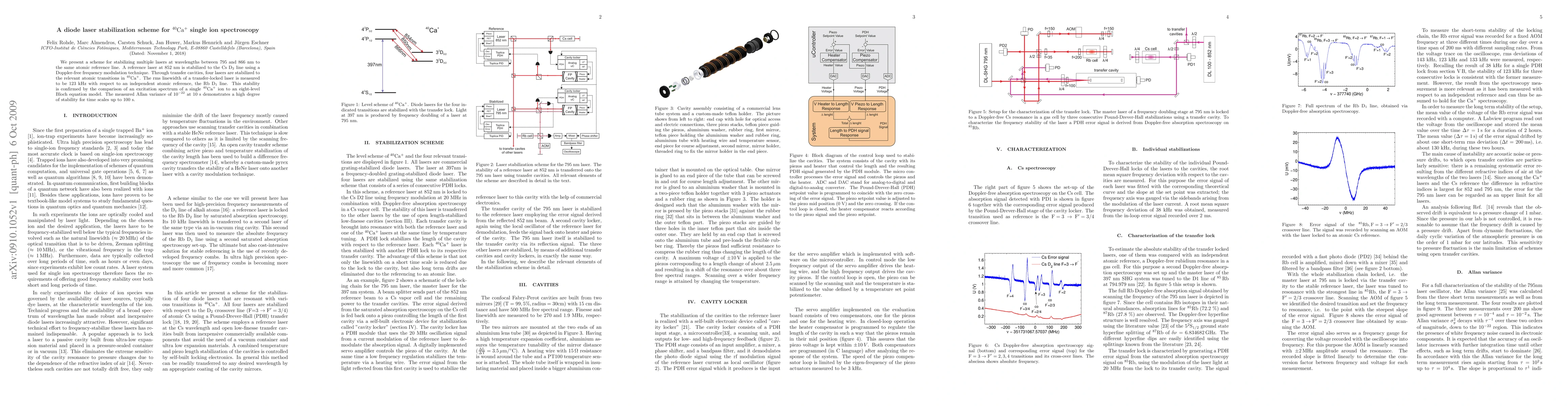 We present a scheme for stabilizing multiple lasers at wavelengths between 795 and 866 nm to the same atomic reference line. A reference laser at 852 nm is stabilized to the Cs D2 line using a Doppler-free frequency modulation technique. Through transfer cavities, four lasers are stabilized to the relevant atomic transitions in 40Ca+. The rms linewidth of a transfer-locked laser is measured to be 123 kHz with respect to an independent atomic reference, the Rb D1 line. This stability is confirmed by the comparison of an excitation spectrum of a single 40Ca+ ion to an eight-level Bloch equation model. The measured Allan variance of 10^(-22) at 10 s demonstrates a high degree of stability for time scales up to 100 s.