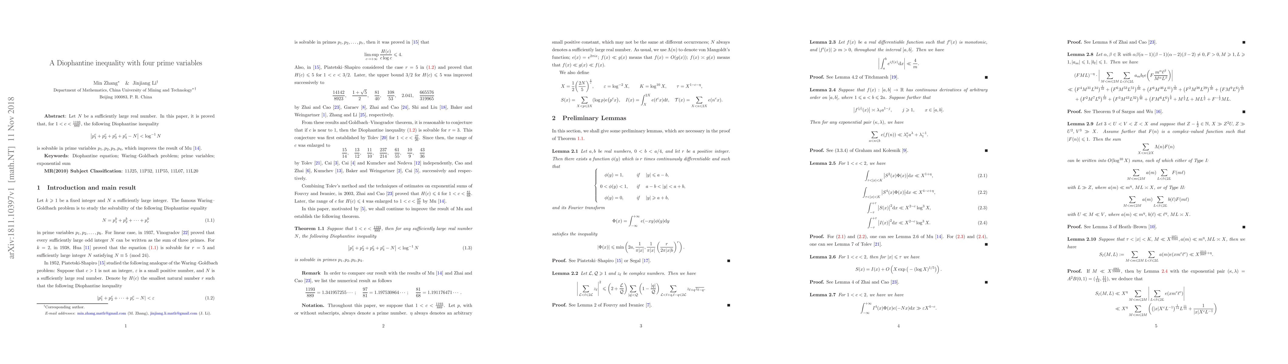 This paper proves that for sufficiently large $N$ and $1<c<\frac{1193}{889}$, the Diophantine inequality involving four primes $p_1, p_2, p_3, p_4$ can be solved, improving upon previous results established by Mu.