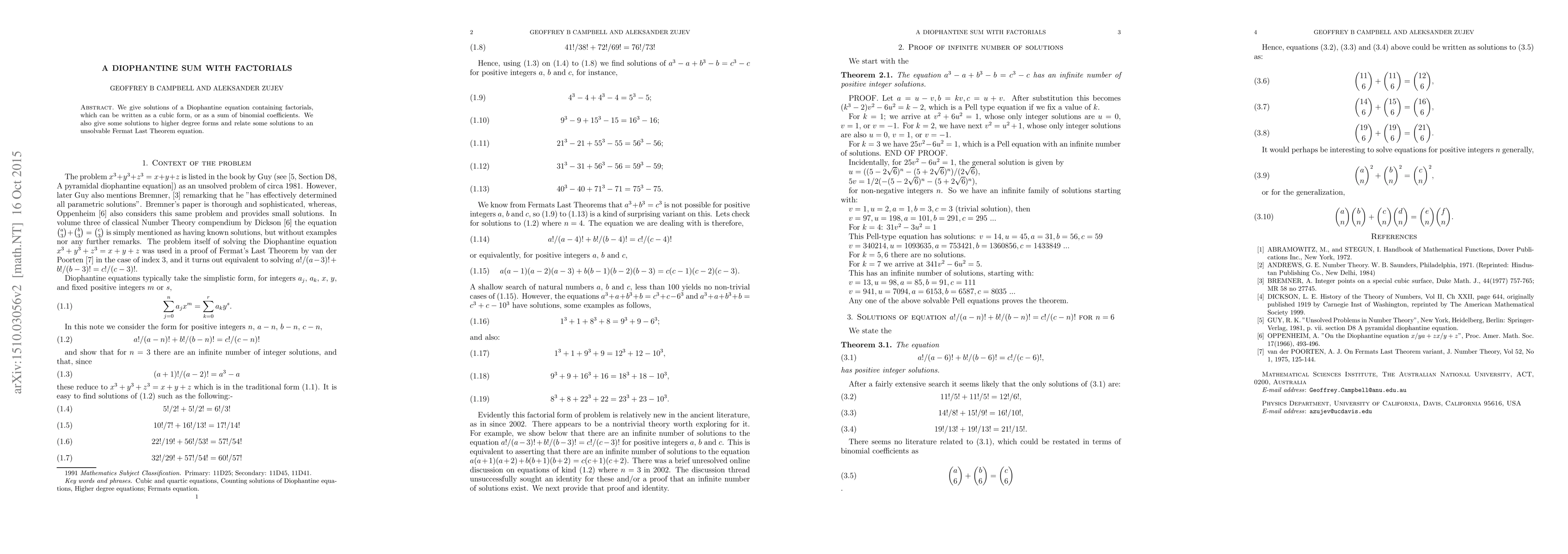 We give solutions of a Diophantine equation containing factorials, which can be written as a cubic form, or as a sum of binomial coefficients. We also give some solutions to higher degree forms and relate some solutions to an unsolvable Fermat Last Theorem equation.