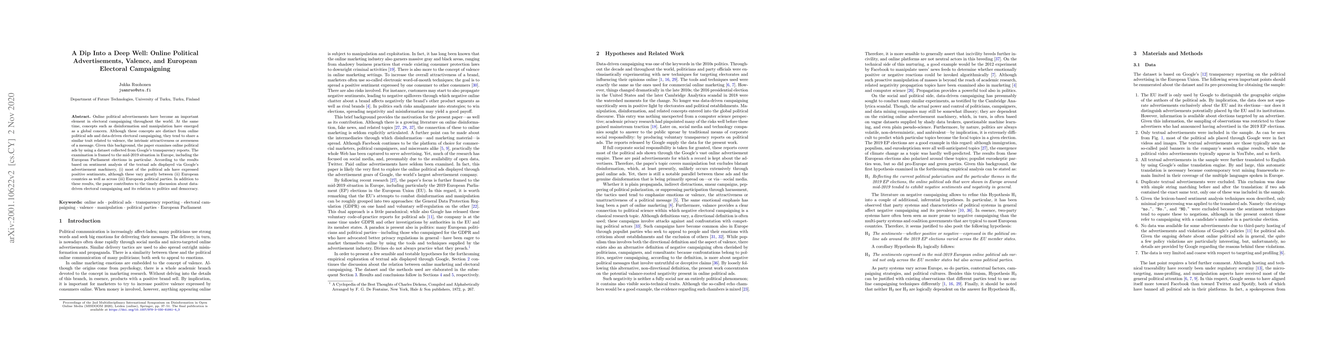 Online political advertisements have become an important element in electoral campaigning throughout the world. At the same time, concepts such as disinformation and manipulation have emerged as a global concern. Although these concepts are distinct from online political ads and data-driven electoral campaigning, they tend to share a similar trait related to valence, the intrinsic attractiveness or averseness of a message. Given this background, the paper examines online political ads by using a dataset collected from Google's transparency reports. The examination is framed to the mid-2019 situation in Europe, including the European Parliament elections in particular. According to the results based on sentiment analysis of the textual ads displayed via Google's advertisement machinery, (i) most of the political ads have expressed positive sentiments, although these vary greatly between (ii) European countries as well as across (iii) European political parties. In addition to these results, the paper contributes to the timely discussion about data-driven electoral campaigning and its relation to politics and democracy.