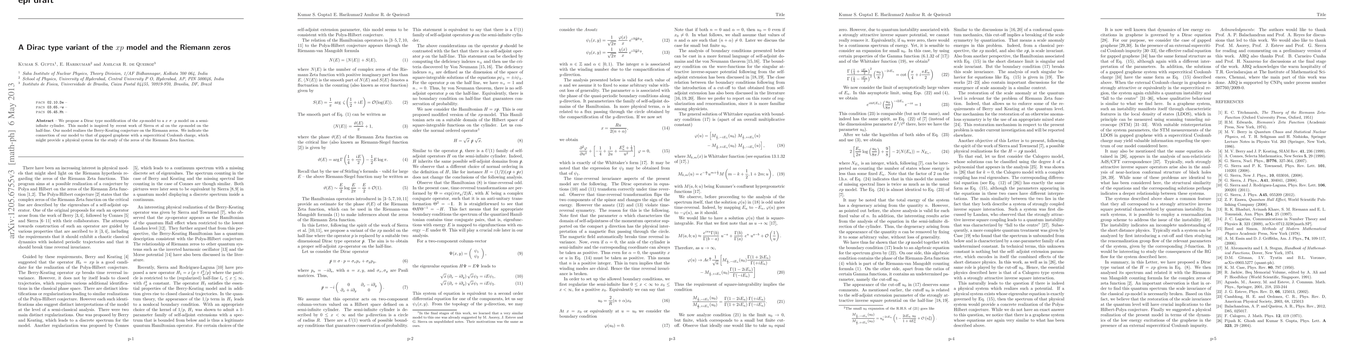 Researchers propose a modified model inspired by recent work on the xp-model to realize the Berry-Keating conjecture on Riemann zeros, connecting it to gapped graphene with a supercritical Coulomb charge.