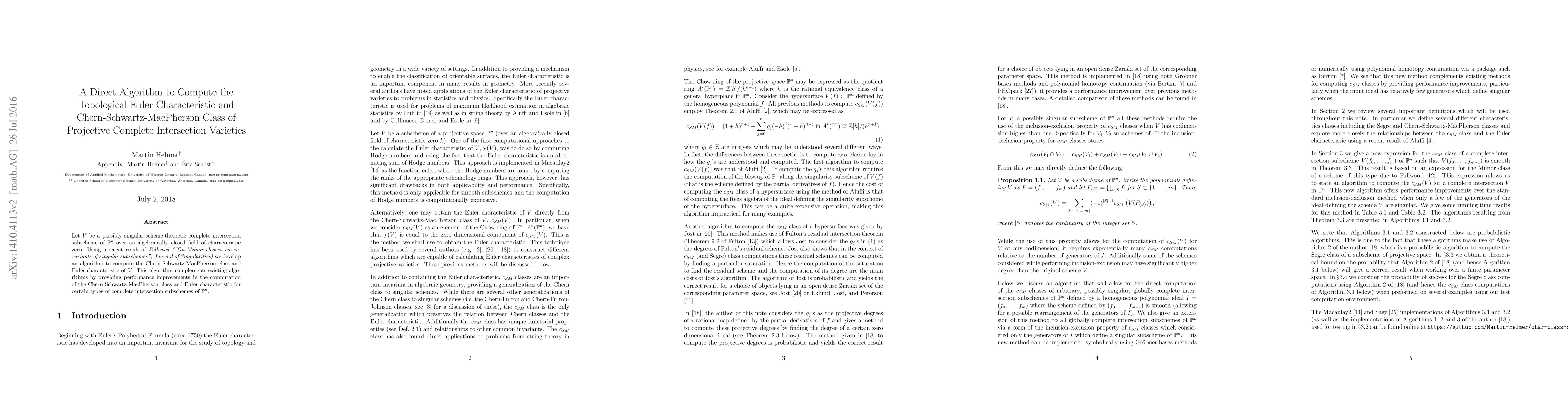 This paper presents an efficient algorithm for calculating the Chern-Schwartz-MacPherson class and topological Euler characteristic of singular complete intersection subschemes in projective space, utilizing a recent result by Fullwood to improve computational performance.