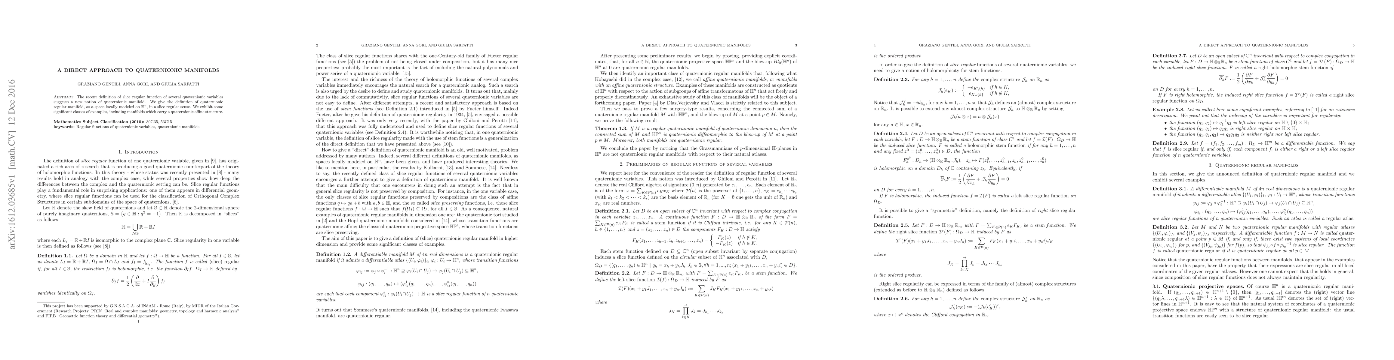 The recent definition of slice regular function of several quaternionic variables suggests a new notion of quaternionic manifold. We give the definition of quaternionic regular manifold, as a space locally modeled on $\mathbb{H}^n$, in a slice regular sense. We exhibit some significant classes of examples, including manifolds which carry a quaternionic affine structure.