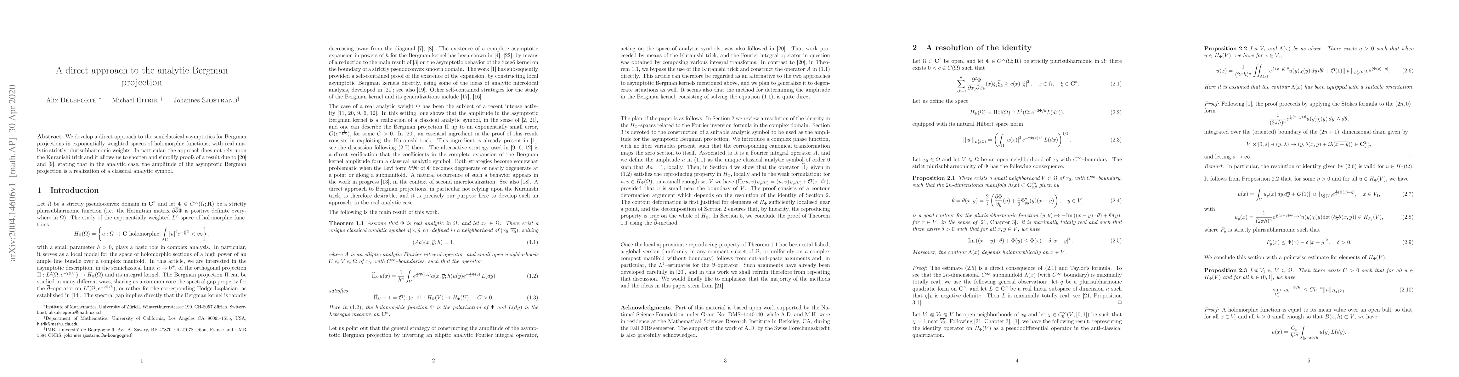 We develop a direct approach to the semiclassical asymptotics for Bergman projections in exponentially weighted spaces of holomorphic functions, with real analytic strictly plurisubharmonic weights. In particular, the approach does not rely upon the Kuranishi trick and it allows us to shorten and simplify proofs of a result due to Rouby-Sj\"ostrand-V\~u Ngoc and Deleporte, stating that in the analytic case, the amplitude of the asymptotic Bergman projection is a realization of a classical analytic symbol.