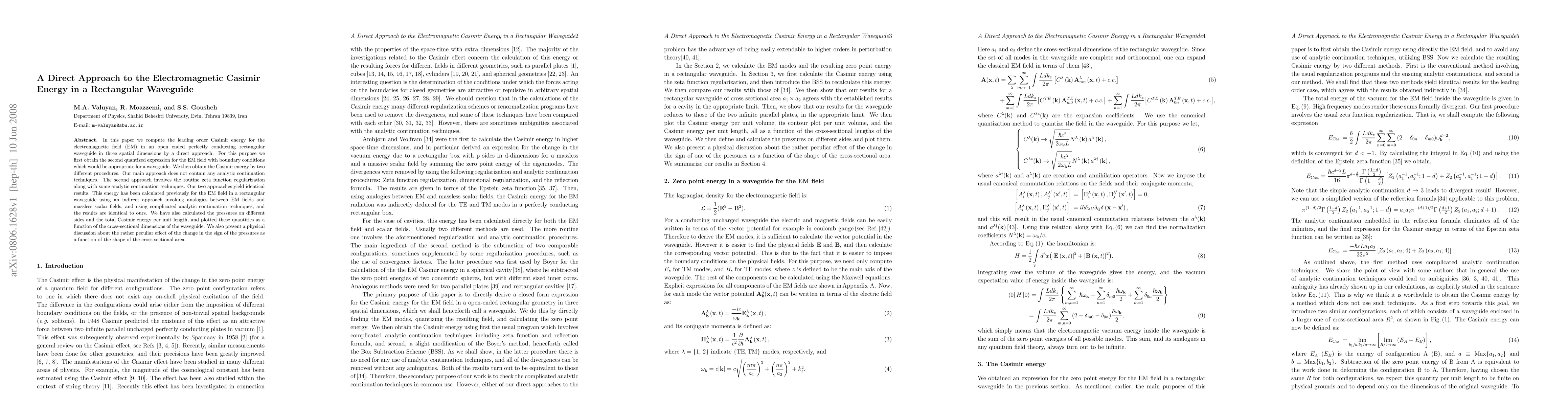 This paper computes the leading order Casimir energy for electromagnetic fields in a rectangular waveguide using a direct approach without analytic continuation, yielding identical results to previous indirect methods. It also discusses the pressure variations and sign changes influenced by the waveguide's cross-sectional shape.