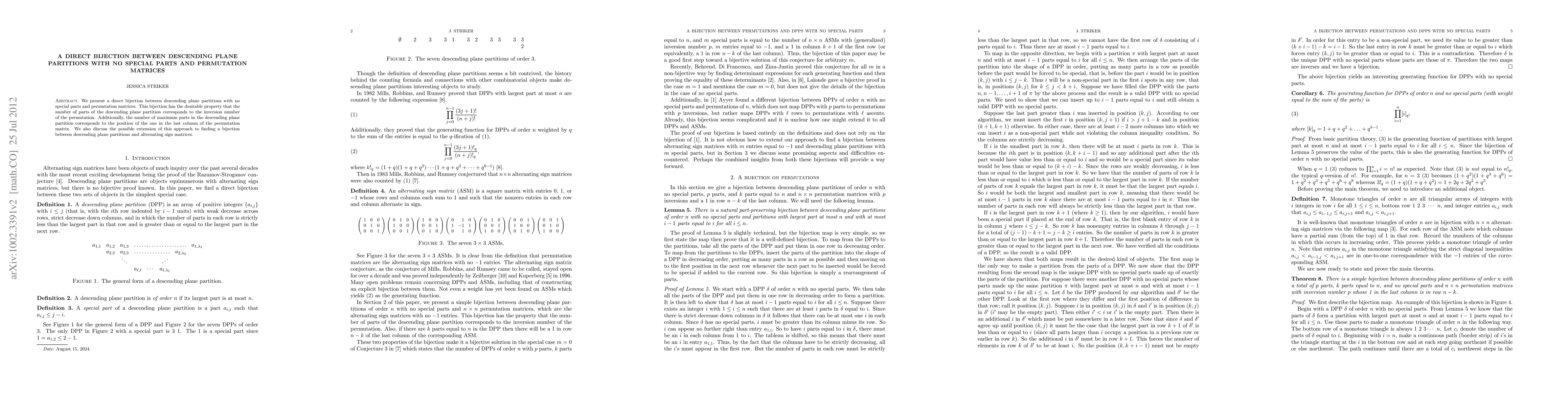 This paper establishes a direct bijection between descending plane partitions with no special parts and permutation matrices, where the partition's part count matches the permutation's inversion number, and the maximum part count corresponds to the position of the last column's one. The authors also explore extending this method to link descending plane partitions with alternating sign matrices.