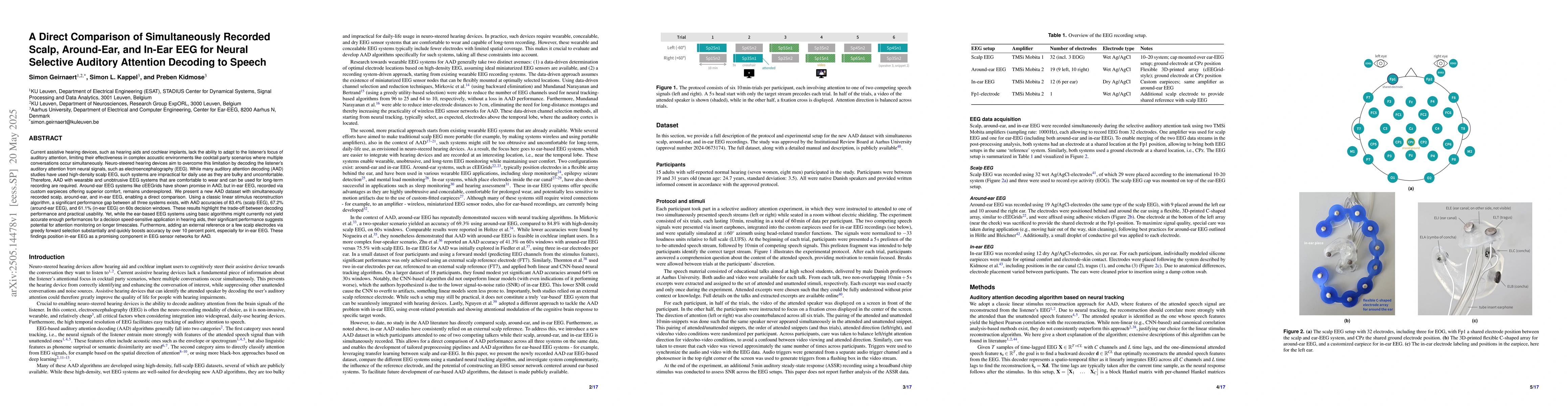 The study simultaneously recorded scalp, around-ear (cEEGrids), and in-ear EEG to decode neural selective auditory attention to speech, using a classic linear stimulus reconstruction algorithm.