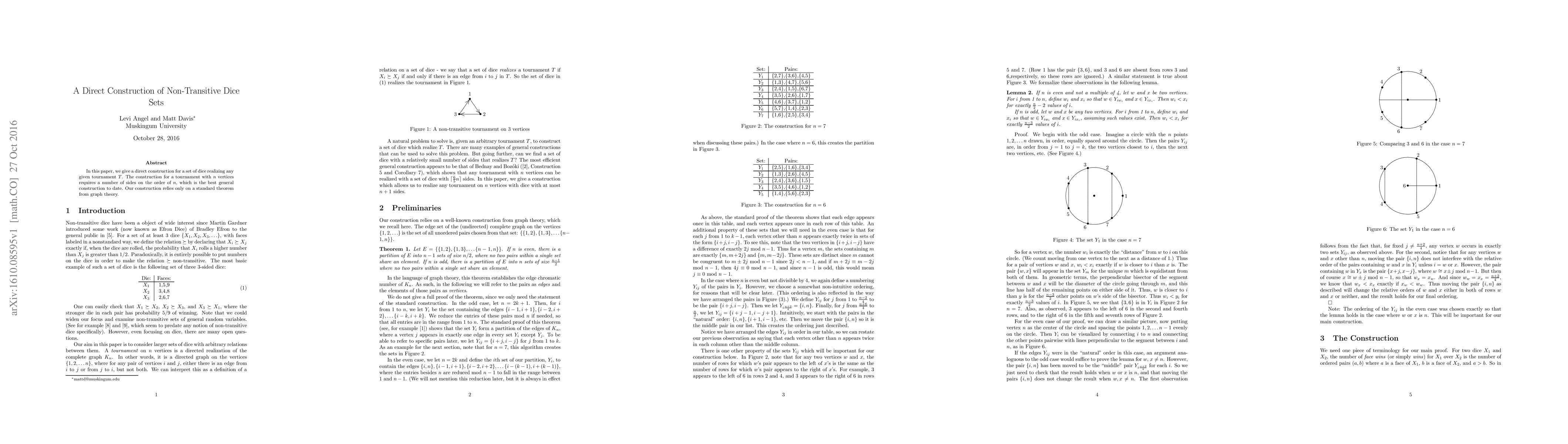 This paper presents a direct method to construct dice sets for any given tournament, using a number of sides proportional to the tournament's vertices. The construction leverages a fundamental theorem from graph theory, offering an efficient solution for non-transitive dice sets.