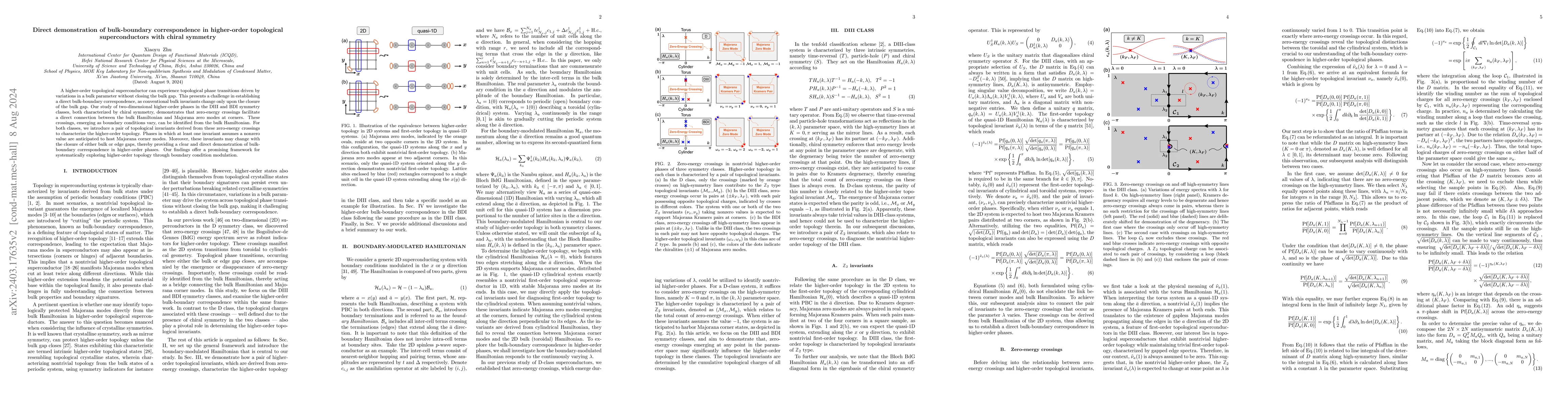 A higher-order topological superconductor can experience topological phase transitions driven by variations in a bulk parameter without closing the bulk gap. This presents a challenge in establishing a direct bulk-boundary correspondence, as conventional bulk invariants change only upon the closure of the bulk gap. Our study of two-dimensional higher-order phases in DIII and BDI symmetry classes, both characterized by chiral symmetry, demonstrates that Fermi level crossings facilitate a direct connection between the bulk Hamiltonian and Majorana zero modes at corners. These crossings, emerging as boundary conditions vary, can be identified from the bulk Hamiltonian. For both classes, we introduce a pair of topological invariants derived from these Fermi level crossings to characterize the higher-order topology. Phases in which at least one invariant assumes a nonzero value are anticipated to host Majorana corner modes. Moreover, these invariants may change with the closure of either bulk or edge gaps, thereby providing a clear and direct demonstration of bulk-boundary correspondence in higher-order phases. Our findings offer a promising framework for systematically exploring higher-order topology through boundary condition modulation.
