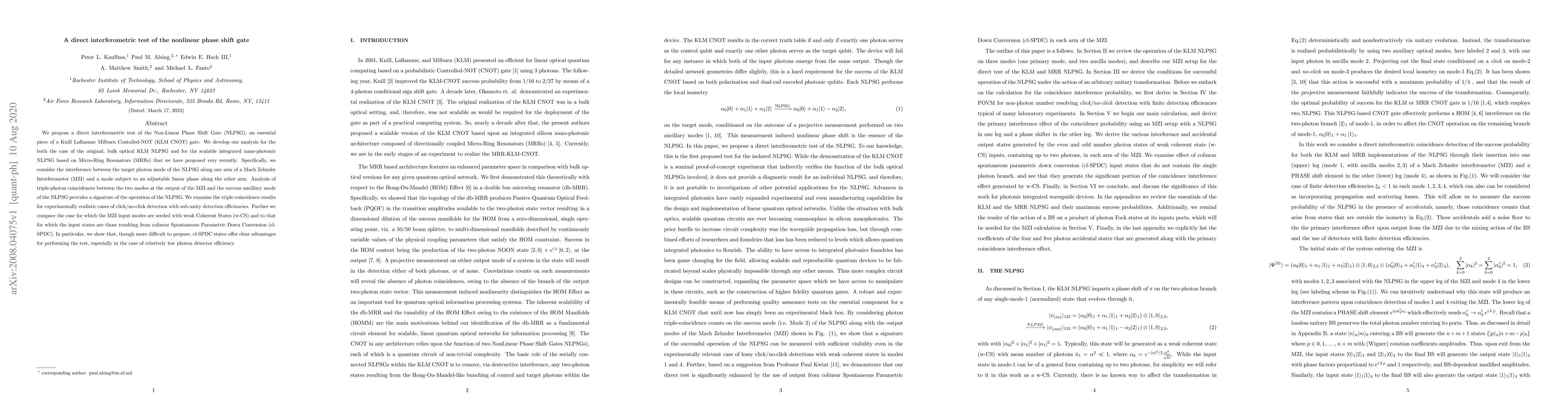 We propose a direct interferometric test of the Non-Linear Phase Shift Gate (NLPSG), an essential piece of a Knill Laflamme Milburn Contolled-NOT (KLM CNOT) gate. We develop our analysis for the both the case of the original, bulk optical KLM NLPSG and for the scalable integrated nano-photonic NLPSG based on Micro-Ring Resonators (MRRs) that we have proposed very recently. Specifically, we consider the interference between the target photon mode of the NLPSG along one arm of a Mach Zehnder Interferometer (MZI) and a mode subject to an adjustable linear phase along the other arm. Analysis of triple-photon coincidences between the two modes at the output of the MZI and the success ancillary mode of the NLPSG provides a signature of the operation of the NLPSG. We examine the triple coincidence results for experimentally realistic cases of click/no-click detection with sub-unity detection efficiencies. Further we compare the case for which the MZI input modes are seeded with weak Coherent States (w-CS) and to that for which the input states are those resulting from colinear Spontaneous Parametric Down Conversion (cl-SPDC). In particular, we show that, though more difficult to prepare, cl-SPDC states offer clear advantages for performing the test, especially in the case of relatively low photon detector efficiency.