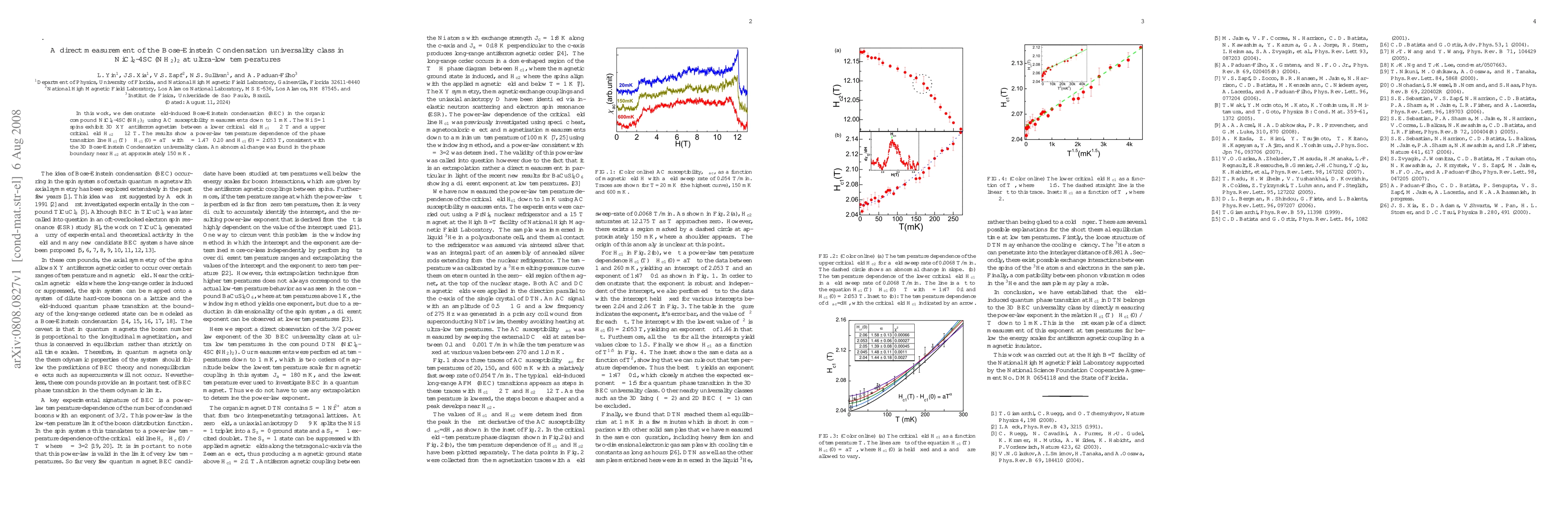 The paper presents a detailed analysis of field-induced BEC in NiCl2-4SC(NH2)2 using AC susceptibility measurements, identifying a power-law temperature dependence of the phase transition line consistent with the 3D BEC universality class.