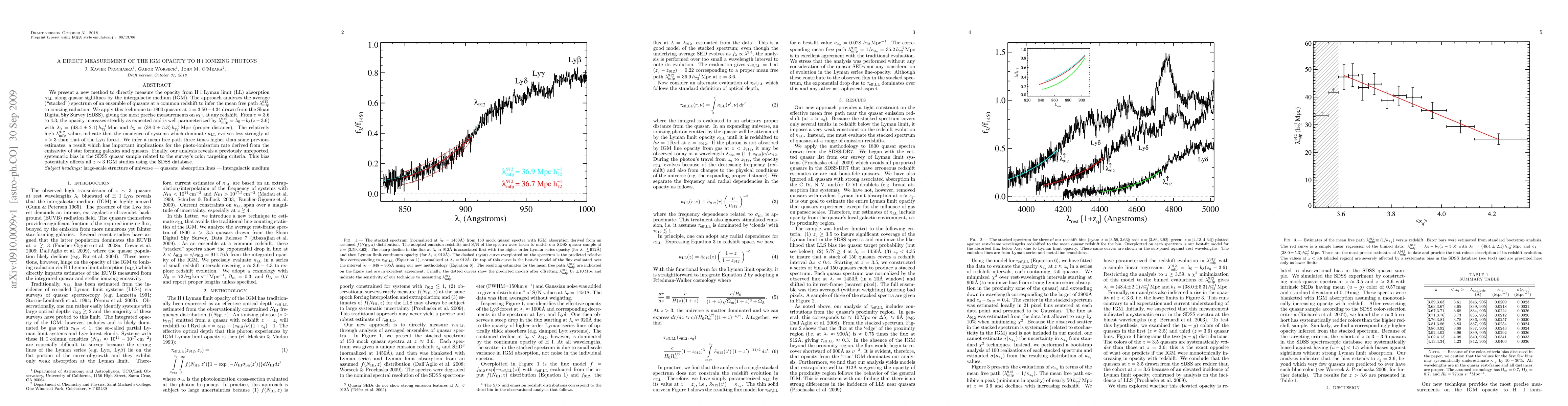 We present a new method to directly measure the opacity from HI Lyman limit (LL) absorption k_LL along quasar sightlines by the intergalactic medium (IGM). The approach analyzes the average (``stacked'') spectrum of an ensemble of quasars at a common redshift to infer the mean free path (MFP) to ionizing radiation. We apply this technique to 1800 quasars at z=3.50-4.34 drawn from the Sloan Digital Sky Survey (SDSS), giving the most precise measurements on k_LL at any redshift. From z=3.6 to 4.3, the opacity increases steadily as expected and is well parameterized by MFP = (48.4 +/- 2.1) - (38.0 +/- 5.3)*(z-3.6) h^-1 Mpc (proper distance). The relatively high MFP values indicate that the incidence of systems which dominate k_LL evolves less strongly at z>3 than that of the Lya forest. We infer a mean free path three times higher than some previous estimates, a result which has important implications for the photo-ionization rate derived from the emissivity of star forming galaxies and quasars. Finally, our analysis reveals a previously unreported, systematic bias in the SDSS quasar sample related to the survey's color targeting criteria. This bias potentially affects all z~3 IGM studies using the SDSS database.