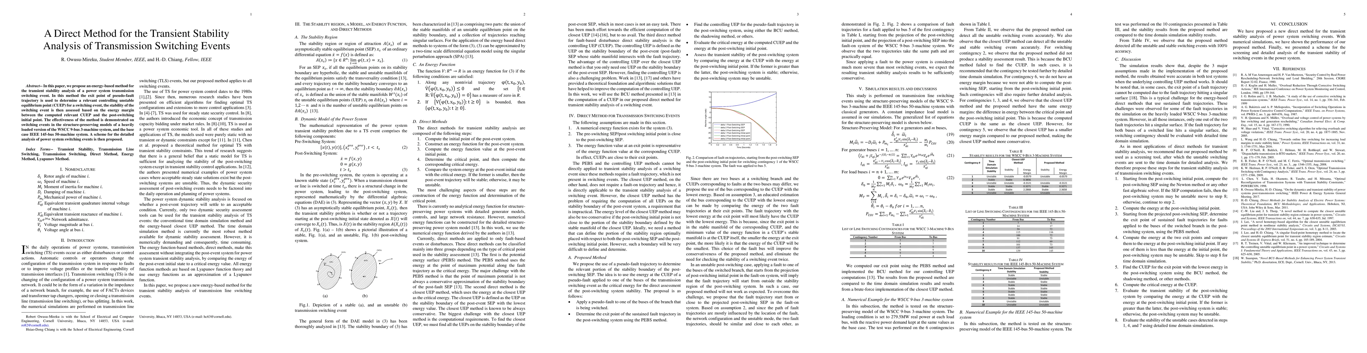 This paper introduces an energy-based method for analyzing transient stability during transmission switching events, determining a controlling unstable equilibrium point (CUEP) using the exit point of a pseudo-fault trajectory, and assessing stability via the energy margin between the CUEP and the post-switching state. The method is validated on the WSCC 9-bus and IEEE 145-bus systems.