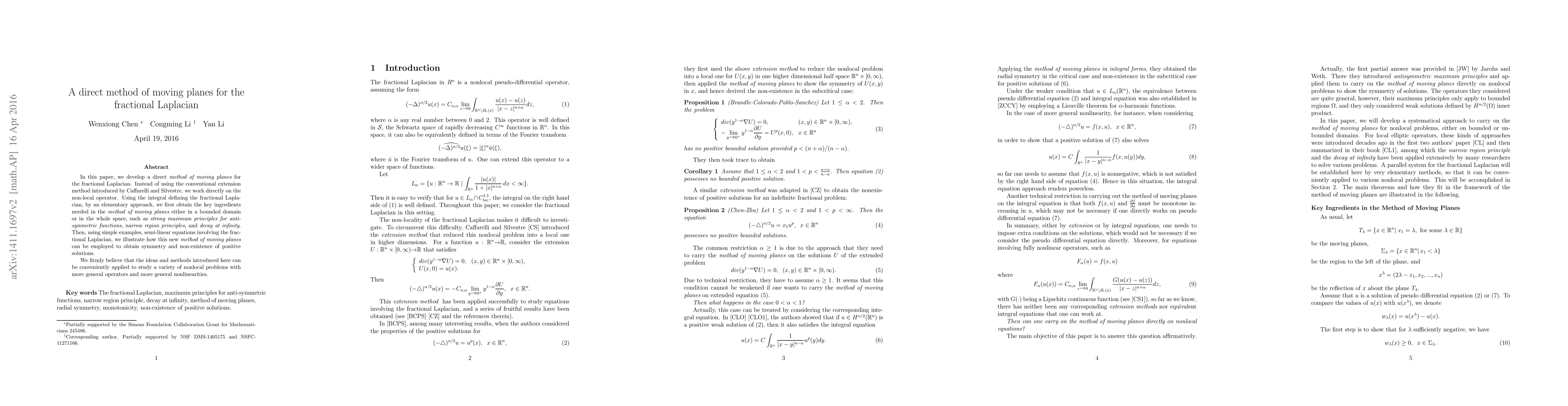 This paper introduces a direct method of moving planes for the fractional Laplacian, bypassing the conventional extension method. It leverages the integral definition of the fractional Laplacian to establish key principles and applies the method to demonstrate symmetry and non-existence of positive solutions in semi-linear equations.