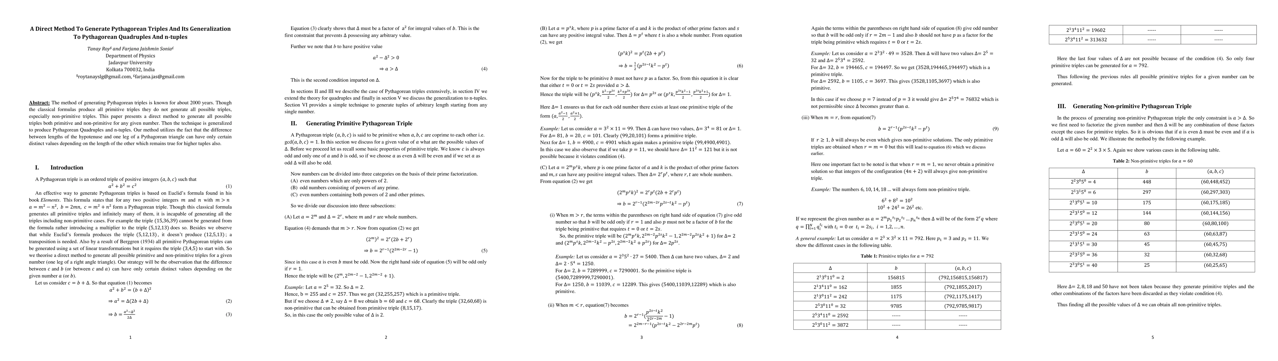 The method of generating Pythagorean triples is known for about 2000 years. Though the classical formulas produce all primitive triples they do not generate all possible triples, especially non-primitive triples. This paper presents a direct method to generate all possible triples both primitive and non-primitive for any given number. Then the technique is generalized to produce Pythagorean Quadruples and n-tuples. Our method utilizes the fact that the difference between lengths of the hypotenuse and one leg of a Pythagorean triangle can have only certain distinct values depending on the length of the other which remains true for higher tuples also.