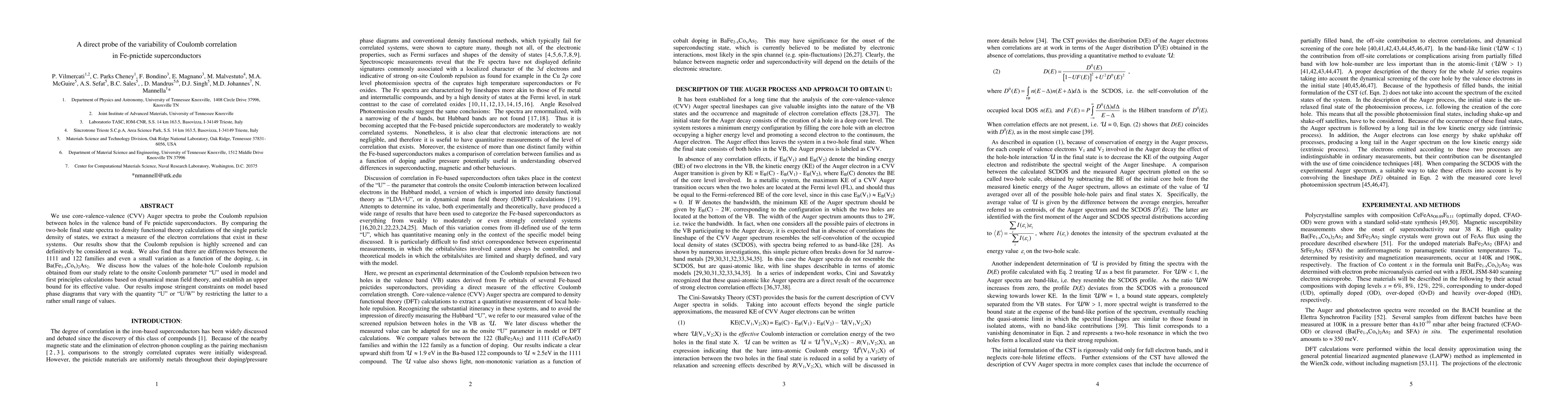 We use core-valence-valence (CVV) Auger spectra to probe the Coulomb repulsion between holes in the valence band of Fe pnictide superconductors. By comparing the two-hole final state spectra to density functional theory calculations of the single particle density of states, we extract a measure of the electron correlations that exist in these systems. Our results show that the Coulomb repulsion is highly screened and can definitively be considered as weak. We also find that there are differences between the 1111 and 122 families and even a small variation as a function of the doping, x, in Ba(Fe1 xCox)2As2. We discuss how the values of the hole-hole Coulomb repulsion obtained from our study relate to the onsite Coulomb parameter "U" used in model and first principles calculations based on dynamical mean field theory, and establish an upper bound for its effective value. Our results impose stringent constraints on model based phase diagrams