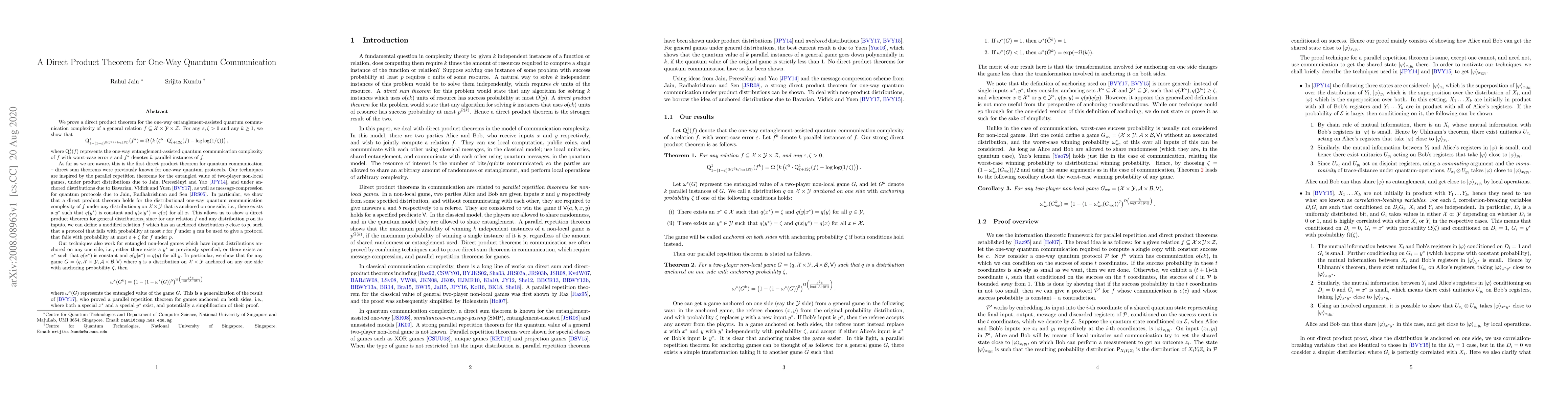 Researchers prove a direct product theorem for one-way quantum communication complexity, showing that entanglement can significantly reduce the number of needed resources to solve certain problems, with implications for quantum computing and cryptography.