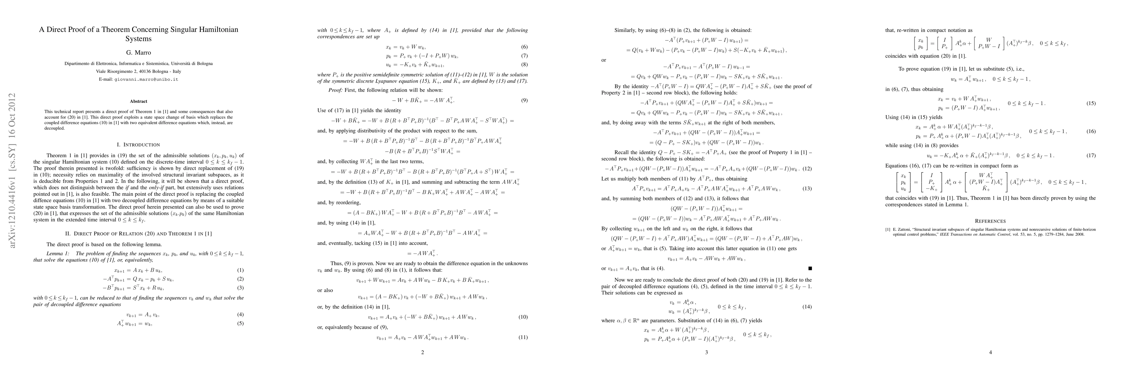 This technical report presents a direct proof of Theorem~1 in [1] and some consequences that also account for (20) in [1]. This direct proof exploits a state space change of basis which replaces the coupled difference equations (10) in [1] with two equivalent difference equations which, instead, are decoupled.