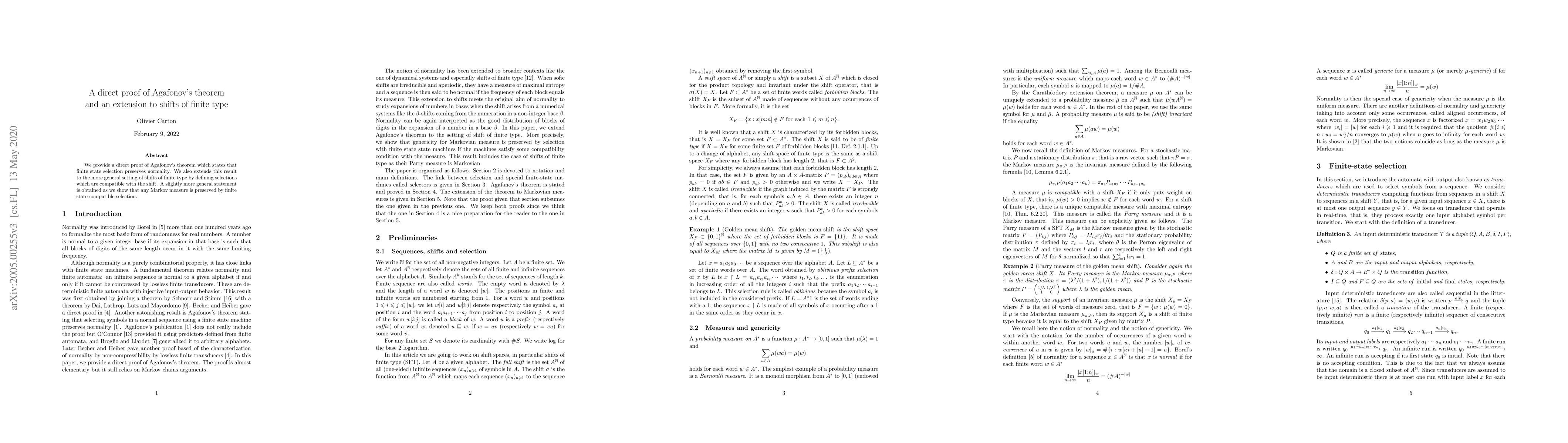 We provide a direct proof of Agafonov's theorem which states that finite state selection preserves normality. We also extends this result to the more general setting of shifts of finite type by defining selections which are compatible the shift. A slightly more general statement is obtained as we show that any Markov measure is preserved by finite state compatible selection.