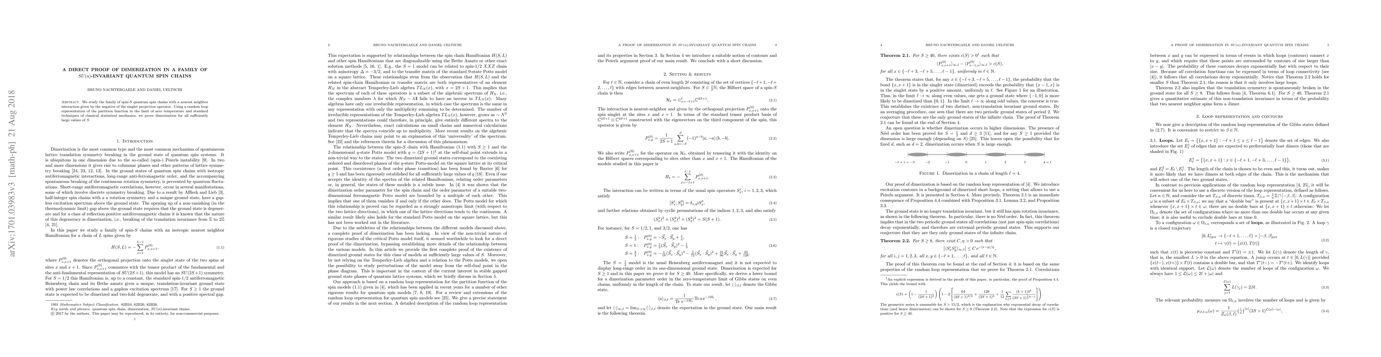 We study the family of spin-S quantum spin chains with a nearest neighbor interaction given by the negative of the singlet projection operator. Using a random loop representation of the partition function in the limit of zero temperature and standard techniques of classical statistical mechanics, we prove dimerization for all sufficiently large values of S.