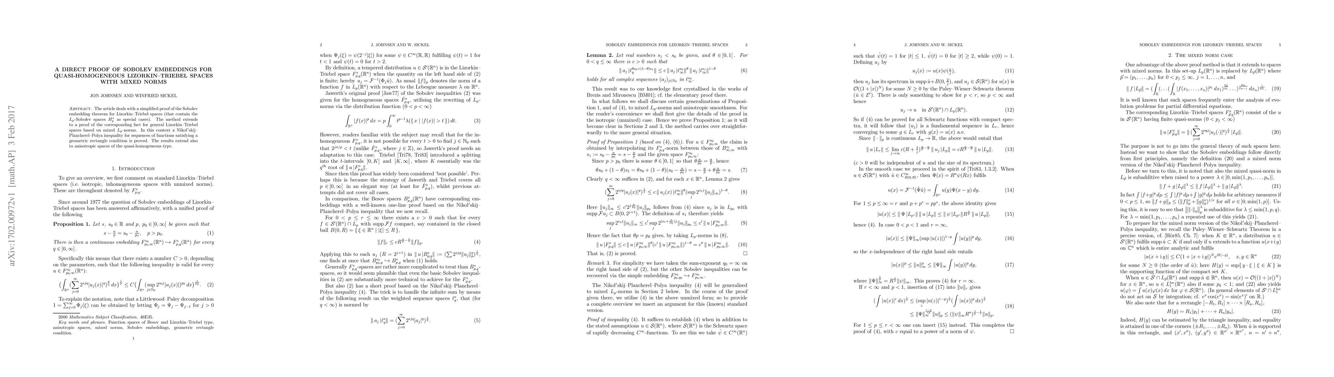 The paper provides a simplified proof of the Sobolev embedding theorem for Lizorkin-Triebel spaces, extending to mixed $L_p$-norms and quasi-homogeneous spaces, utilizing a Nikol'skij-Plancherel-Polya inequality for geometric rectangle functions.