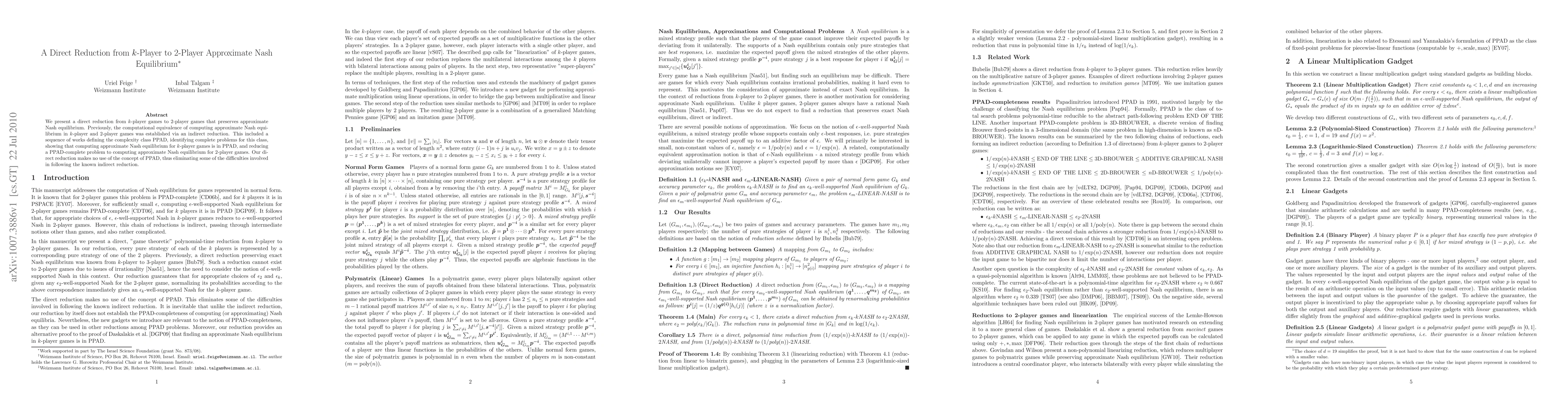 This paper introduces a direct reduction method from k-player to 2-player games that maintains approximate Nash equilibrium, contrasting with previous indirect reductions that utilized the PPAD complexity class, thereby simplifying the computational equivalence process.
