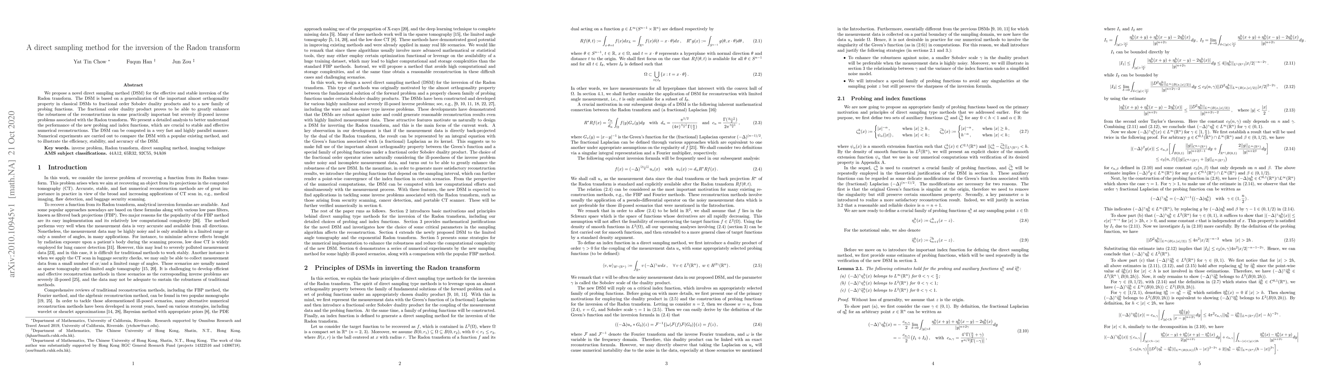 We propose a novel direct sampling method (DSM) for the effective and stable inversion of the Radon transform. The DSM is based on a generalization of the important almost orthogonality property in classical DSMs to fractional order Sobolev duality products and to a new family of probing functions. The fractional order duality product proves to be able to greatly enhance the robustness of the reconstructions in some practically important but severely ill-posed inverse problems associated with the Radon transform. We present a detailed analysis to better understand the performance of the new probing and index functions, which are crucial to stable and effective numerical reconstructions. The DSM can be computed in a very fast and highly parallel manner. Numerical experiments are carried out to compare the DSM with a popular existing method, and to illustrate the efficiency, stability, and accuracy of the DSM.