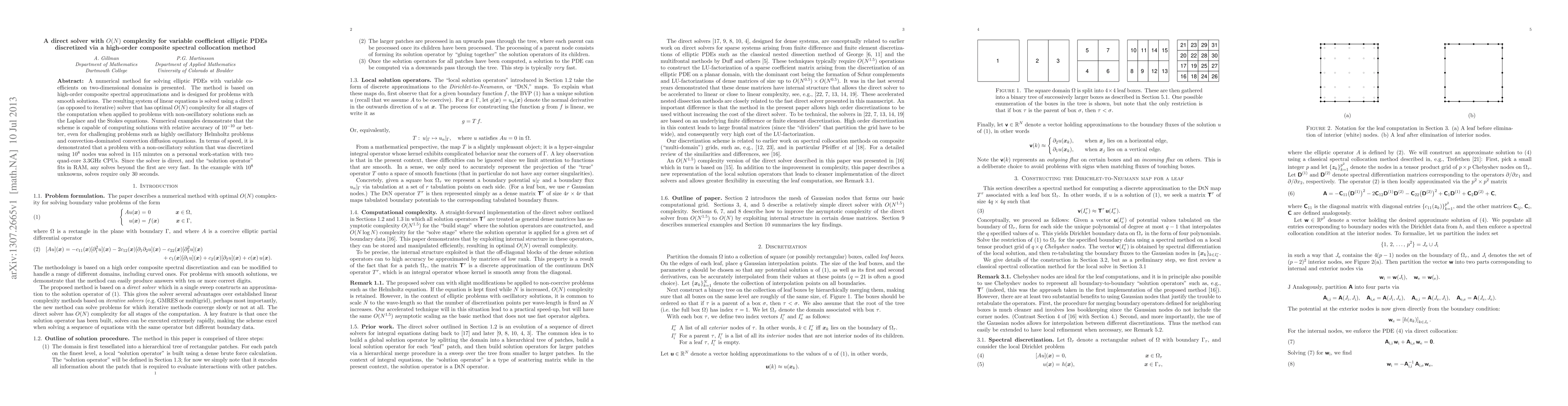 A numerical method for solving elliptic PDEs with variable coefficients on two-dimensional domains is presented. The method is based on high-order composite spectral approximations and is designed for problems with smooth solutions. The resulting system of linear equations is solved using a direct (as opposed to iterative) solver that has optimal O(N) complexity for all stages of the computation when applied to problems with non-oscillatory solutions such as the Laplace and the Stokes equations. Numerical examples demonstrate that the scheme is capable of computing solutions with relative accuracy of $10^{-10}$ or better, even for challenging problems such as highly oscillatory Helmholtz problems and convection-dominated convection diffusion equations. In terms of speed, it is demonstrated that a problem with a non-oscillatory solution that was discretized using $10^{8}$ nodes was solved in 115 minutes on a personal work-station with two quad-core 3.3GHz CPUs. Since the solver is direct, and the "solution operator" fits in RAM, any solves beyond the first are very fast. In the example with $10^{8}$ unknowns, solves require only 30 seconds.