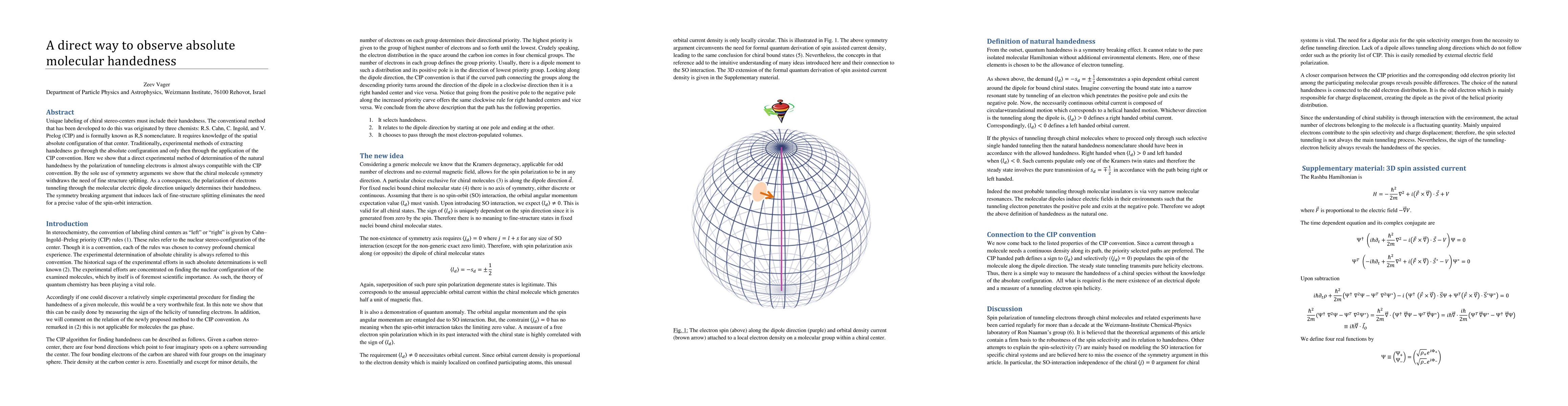 Unique labeling of chiral stereo-centers must include their handedness. The conventional method that has been developed to do this was originated by three chemists: R.S. Cahn, C. Ingold, and V. Prelog (CIP) and is formally known as R,S nomenclature. It requires knowledge of the spatial absolute configuration of that center. Traditionally, experimental methods of extracting handedness go through the absolute configuration and only then through the application of the CIP convention. Here we show that a direct experimental method of determination of the natural handedness by the polarization of tunneling electrons is almost always compatible with the CIP convention. By the sole use of symmetry arguments we show that the chiral molecule symmetry withdraws the need of fine structure splitting. As a consequence, the polarization of electrons tunneling through the molecular electric dipole direction uniquely determines their handedness. The symmetry breaking argument that induces lack of fine-structure splitting eliminates the need for a precise value of the spin-orbit interaction.