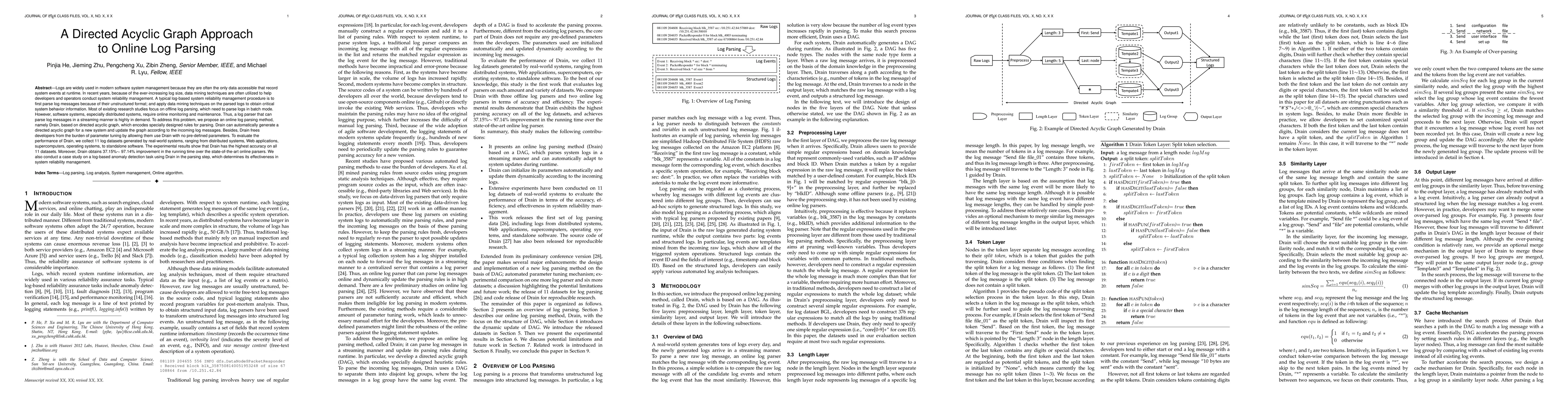 The paper proposes Drain, an online log parsing method based on directed acyclic graphs, to address the challenge of real-time log parsing in large-scale software systems. Drain demonstrates superior accuracy and efficiency compared to existing online parsers, achieving significant improvements in running time.