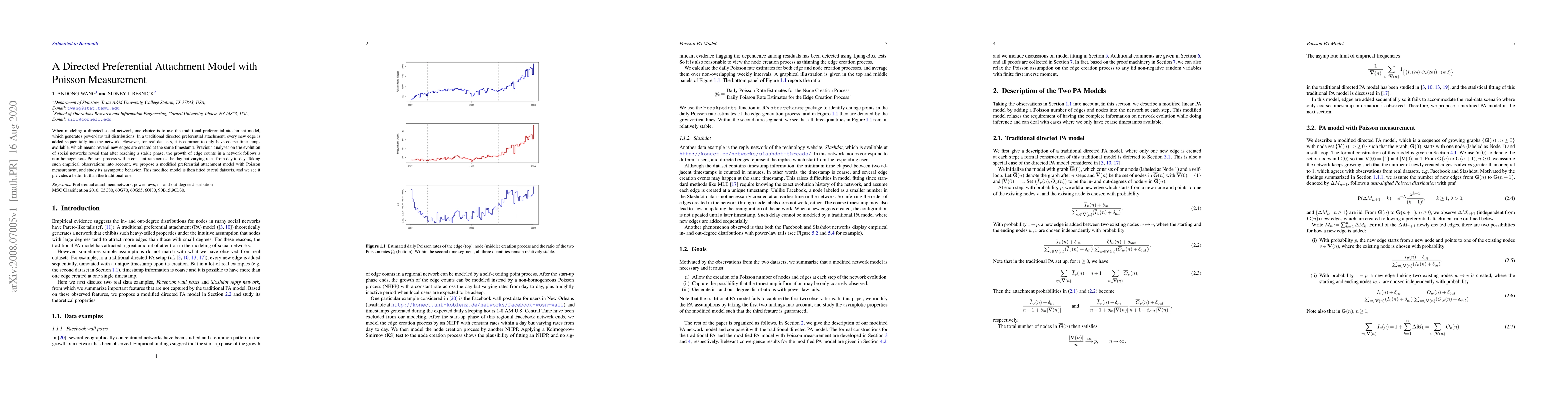 When modeling a directed social network, one choice is to use the traditional preferential attachment model, which generates power-law tail distributions. In a traditional directed preferential attachment, every new edge is added sequentially into the network. However, for real datasets, it is common to only have coarse timestamps available, which means several new edges are created at the same timestamp. Previous analyses on the evolution of social networks reveal that after reaching a stable phase, the growth of edge counts in a network follows a non-homogeneous Poisson process with a constant rate across the day but varying rates from day to day. Taking such empirical observations into account, we propose a modified preferential attachment model with Poisson measurement, and study its asymptotic behavior. This modified model is then fitted to real datasets, and we see it provides a better fit than the traditional one.