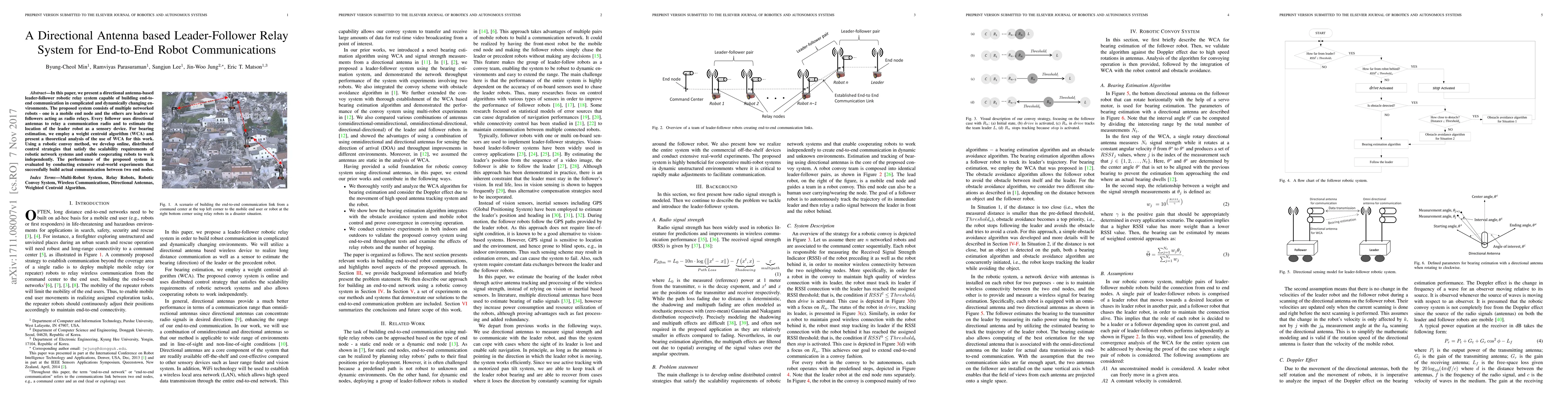 This paper introduces a directional antenna-based leader-follower relay system for robot communications, employing a weight centroid algorithm for bearing estimation and distributed control strategies. Real-world experiments demonstrate successful end-to-end communication in dynamic environments.