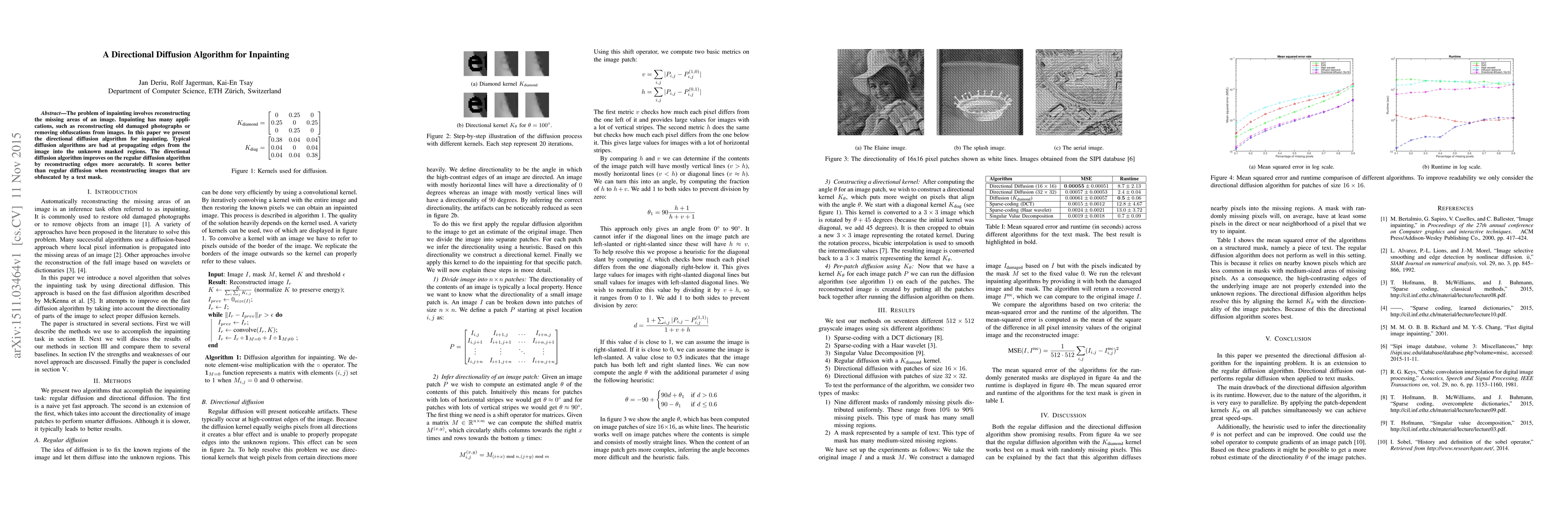 The problem of inpainting involves reconstructing the missing areas of an image. Inpainting has many applications, such as reconstructing old damaged photographs or removing obfuscations from images. In this paper we present the directional diffusion algorithm for inpainting. Typical diffusion algorithms are bad at propagating edges from the image into the unknown masked regions. The directional diffusion algorithm improves on the regular diffusion algorithm by reconstructing edges more accurately. It scores better than regular diffusion when reconstructing images that are obfuscated by a text mask.