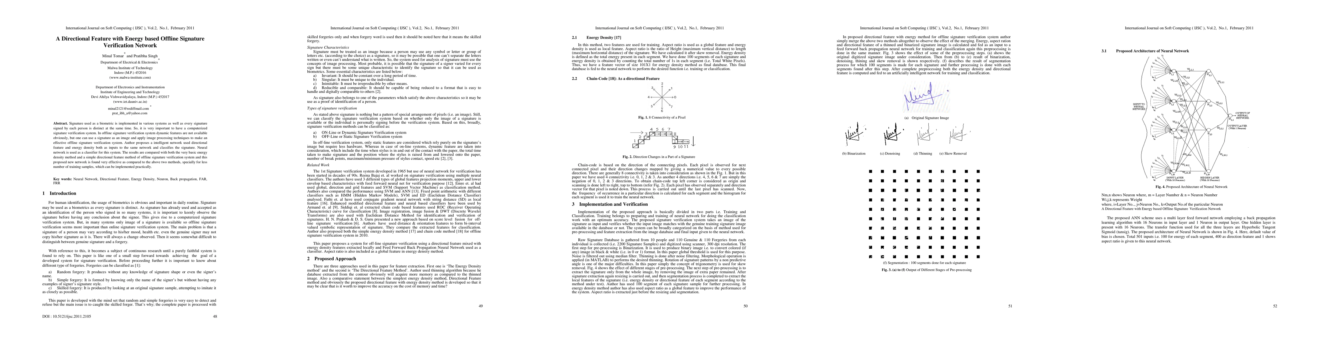 Signature used as a biometric is implemented in various systems as well as every signature signed by each person is distinct at the same time. So, it is very important to have a computerized signature verification system. In offline signature verification system dynamic features are not available obviously, but one can use a signature as an image and apply image processing techniques to make an effective offline signature verification system. Author proposes a intelligent network used directional feature and energy density both as inputs to the same network and classifies the signature. Neural network is used as a classifier for this system. The results are compared with both the very basic energy density method and a simple directional feature method of offline signature verification system and this proposed new network is found very effective as compared to the above two methods, specially for less number of training samples, which can be implemented practically.