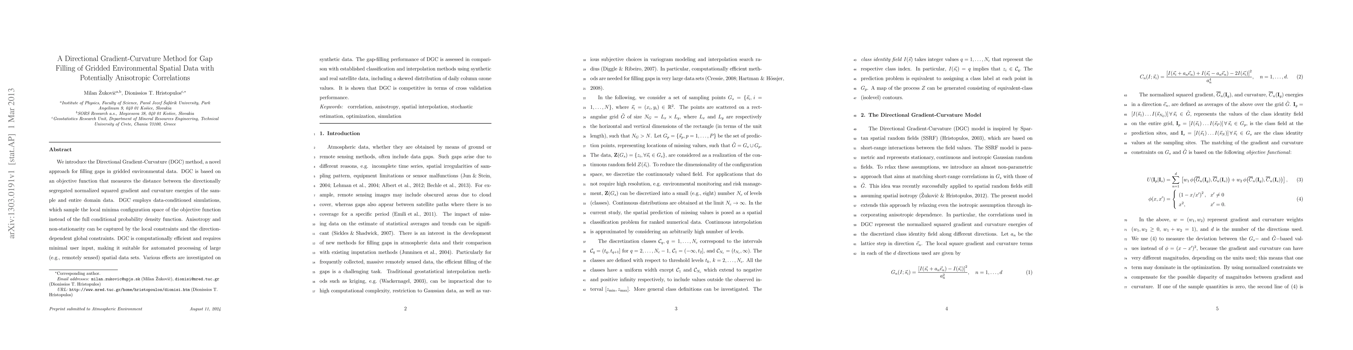 We introduce the Directional Gradient-Curvature (DGC) method, a novel approach for filling gaps in gridded environmental data. DGC is based on an objective function that measures the distance between the directionally segregated normalized squared gradient and curvature energies of the sample and entire domain data. DGC employs data-conditioned simulations, which sample the local minima configuration space of the objective function instead of the full conditional probability density function. Anisotropy and non-stationarity can be captured by the local constraints and the direction-dependent global constraints. DGC is computationally efficient and requires minimal user input, making it suitable for automated processing of large (e.g., remotely sensed) spatial data sets. Various effects are investigated on synthetic data. The gap-filling performance of DGC is assessed in comparison with established classification and interpolation methods using synthetic and real satellite data, including a skewed distribution of daily column ozone values. It is shown that DGC is competitive in terms of cross validation performance.