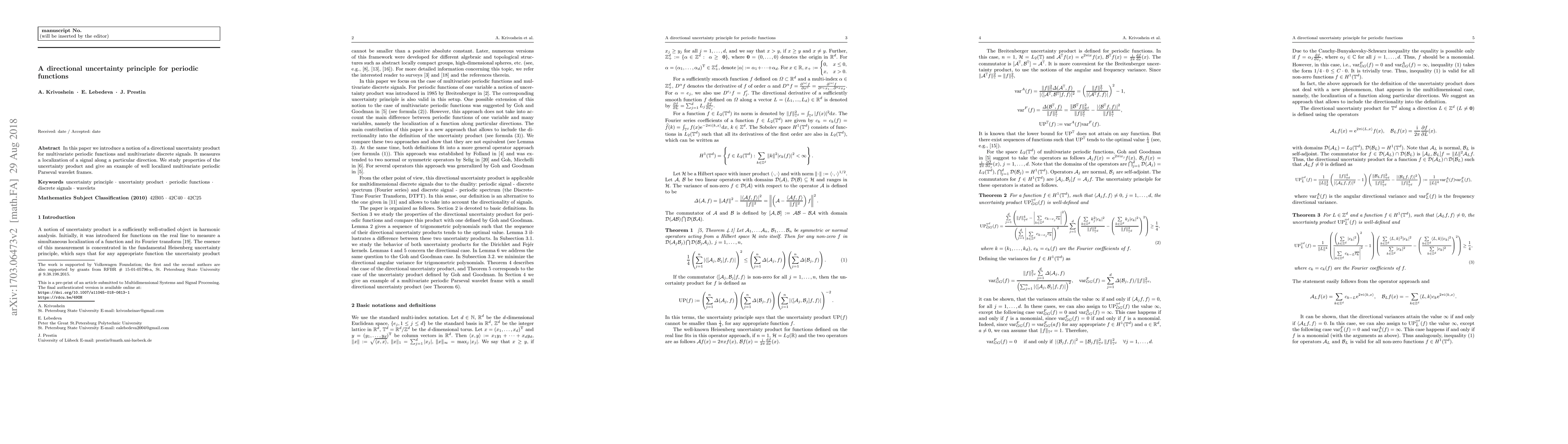 In this paper we introduce a notion of a directional uncertainty product for multivariate periodic functions. It measures a localization of a function along a particular direction. We study properties of the uncertainty product and give an example of well localized multivariate periodic Parseval wavelet frames.