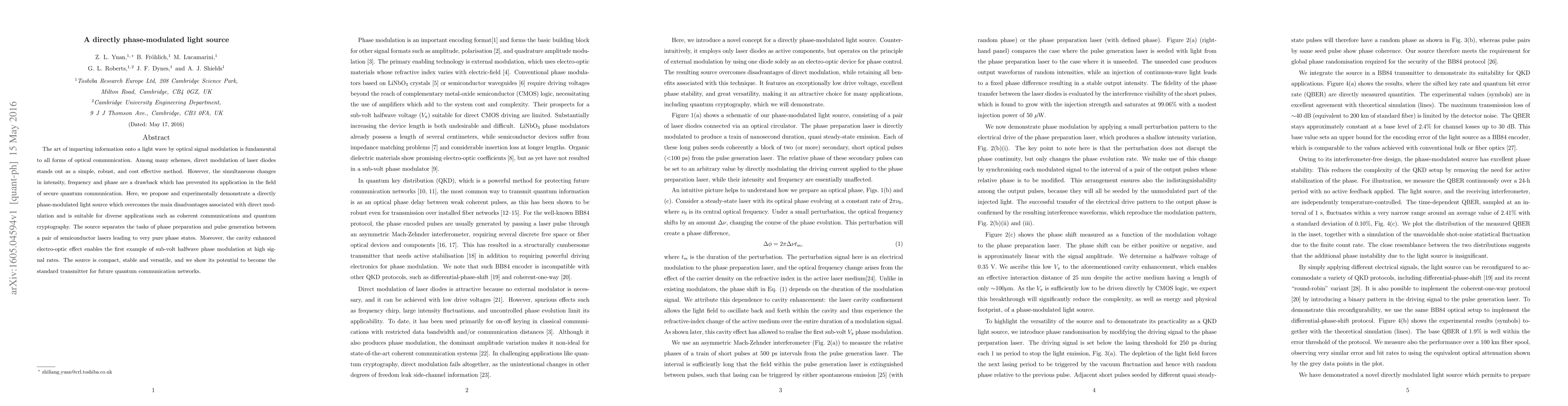 The art of imparting information onto a light wave by optical signal modulation is fundamental to all forms of optical communication. Among many schemes, direct modulation of laser diodes stands out as a simple, robust, and cost effective method. However, the simultaneous changes in intensity, frequency and phase are a drawback which has prevented its application in the field of secure quantum communication. Here, we propose and experimentally demonstrate a directly phase-modulated light source which overcomes the main disadvantages associated with direct modulation and is suitable for diverse applications such as coherent communications and quantum cryptography. The source separates the tasks of phase preparation and pulse generation between a pair of semiconductor lasers leading to very pure phase states. Moreover, the cavity enhanced electro-optic effect enables the first example of sub-volt halfwave phase modulation at high signal rates. The source is compact, stable and versatile, and we show its potential to become the standard transmitter for future quantum communication networks.