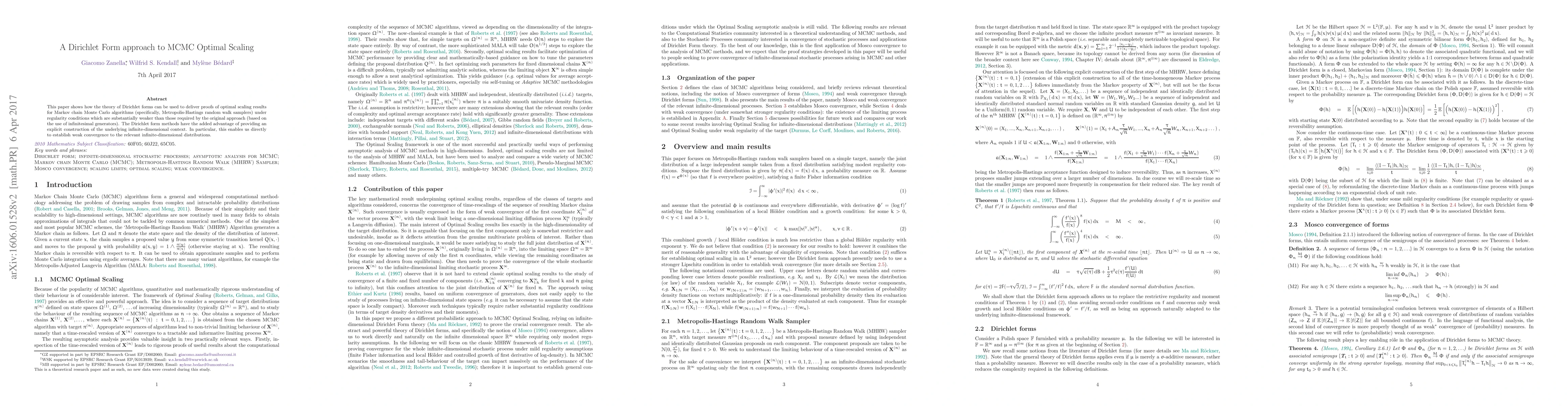 This paper utilizes Dirichlet forms to prove optimal scaling results for Metropolis-Hastings random walk samplers in MCMC, under weaker conditions than traditional methods. It also provides an explicit construction of the underlying infinite-dimensional context, facilitating direct establishment of weak convergence to infinite-dimensional distributions.
