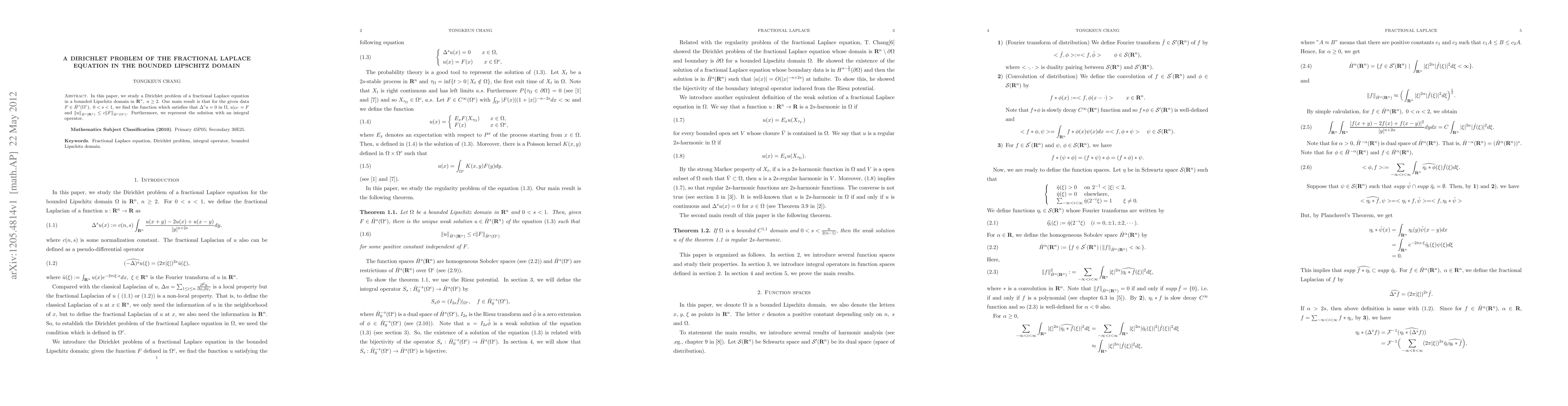 This paper investigates a Dirichlet problem for a fractional Laplace equation in a bounded Lipschitz domain. The main result establishes the existence of a solution satisfying the equation within the domain and boundary conditions, with a bounded norm in a fractional Sobolev space.