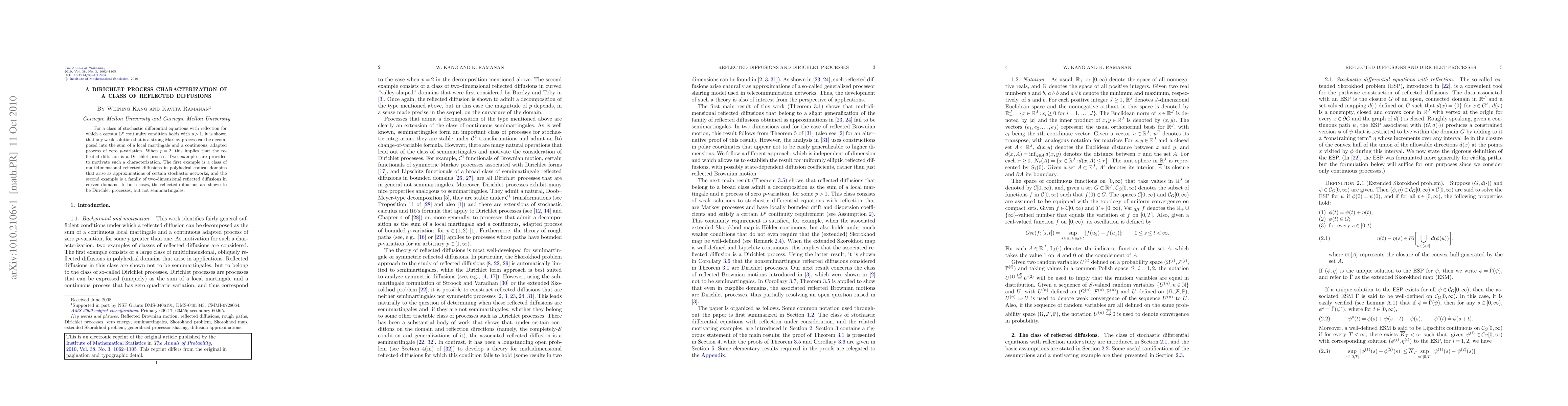 For a class of stochastic differential equations with reflection for which a certain ${\mathbb{L}}^p$ continuity condition holds with $p>1$, it is shown that any weak solution that is a strong Markov process can be decomposed into the sum of a local martingale and a continuous, adapted process of zero $p$-variation. When $p=2$, this implies that the reflected diffusion is a Dirichlet process. Two examples are provided to motivate such a characterization. The first example is a class of multidimensional reflected diffusions in polyhedral conical domains that arise as approximations of certain stochastic networks, and the second example is a family of two-dimensional reflected diffusions in curved domains. In both cases, the reflected diffusions are shown to be Dirichlet processes, but not semimartingales.