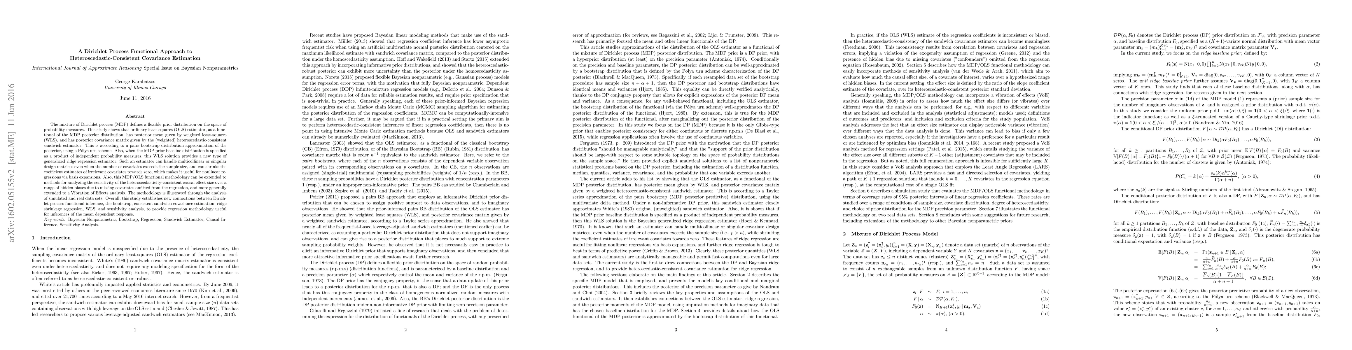 This paper proposes a Dirichlet process functional approach to heteroscedastic-consistent covariance estimation, showing that the ordinary least-squares estimator under a mixture of Dirichlet process prior leads to weighted least-squares solutions and heteroscedastic-consistent sandwich estimators. It also introduces a new generalized ridge regression method that effectively handles multicollinearity and can shrink irrelevant covariate coefficients.