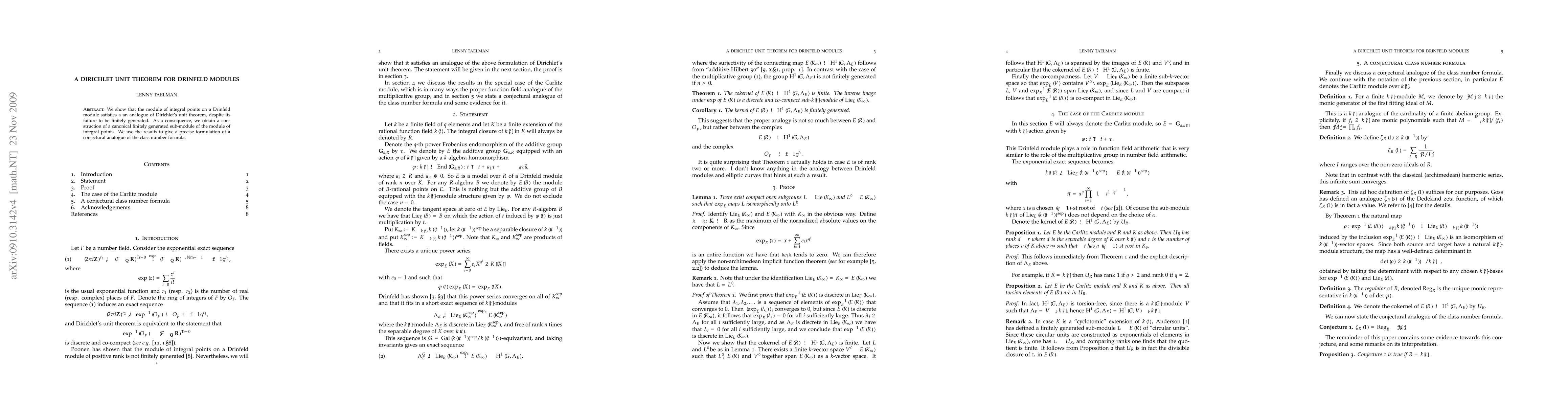 This paper demonstrates an analogue of Dirichlet's unit theorem for the module of integral points on a Drinfeld module, despite its non-finitely generated nature. It also constructs a canonical finitely generated sub-module and formulates a conjectured class number formula.
