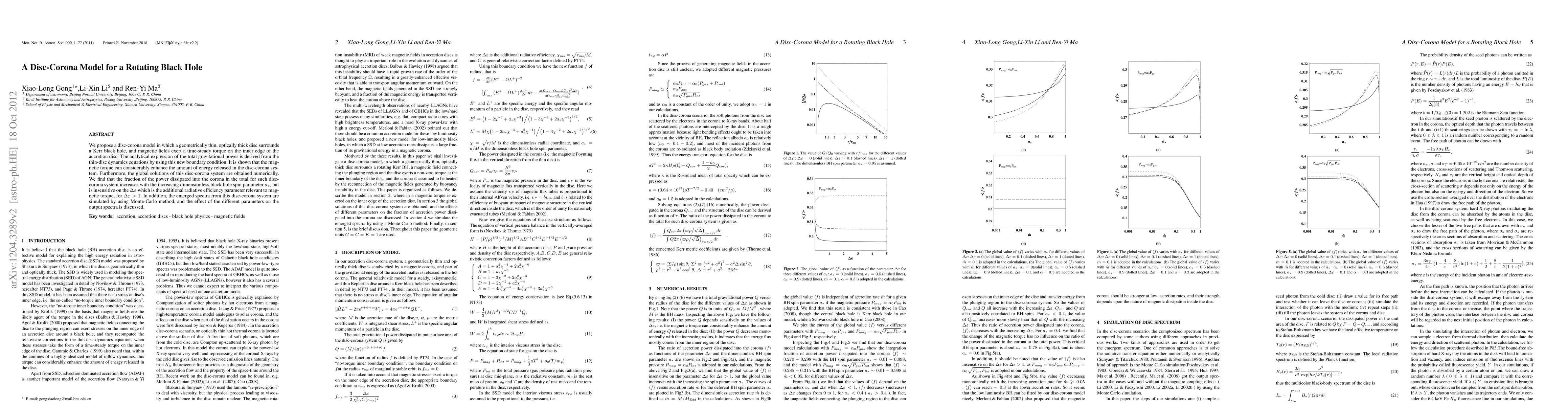 We propose a disc-corona model in which a geometrically thin, optically thick disc surrounds a Kerr black hole, and magnetic fields exert a time-steady torque on the inner edge of the accretion disc. The analytical expression of the total gravitational power is derived from the thin-disc dynamics equations by using this new boundary condition. It is shown that the magnetic torque can considerably enhance the amount of energy released in the disc-corona system. Furthermore, the global solutions of this disc-corona system are obtained numerically. We find that the fraction of the power dissipated into the corona in the total for such disc-corona system increases with the increasing dimensionless black hole spin parameter $a_\ast $, but is insensitive on the $\Delta \varepsilon $ which is the additional radiative efficiency parameter relevant to magnetic torque, for $\Delta\varepsilon > 1$. In addition, the emerged spectra from this disc-corona system are simulated by using Monte-Carlo method, and the effect of the different parameters on the output spectra is discussed.